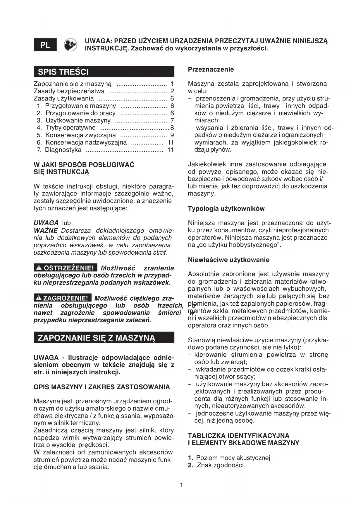 Zapoznanie się z maszyną ............................ 1 Zasady bezpieczeństwa ................................ 2 Zasady użytkowania ...................................... 6