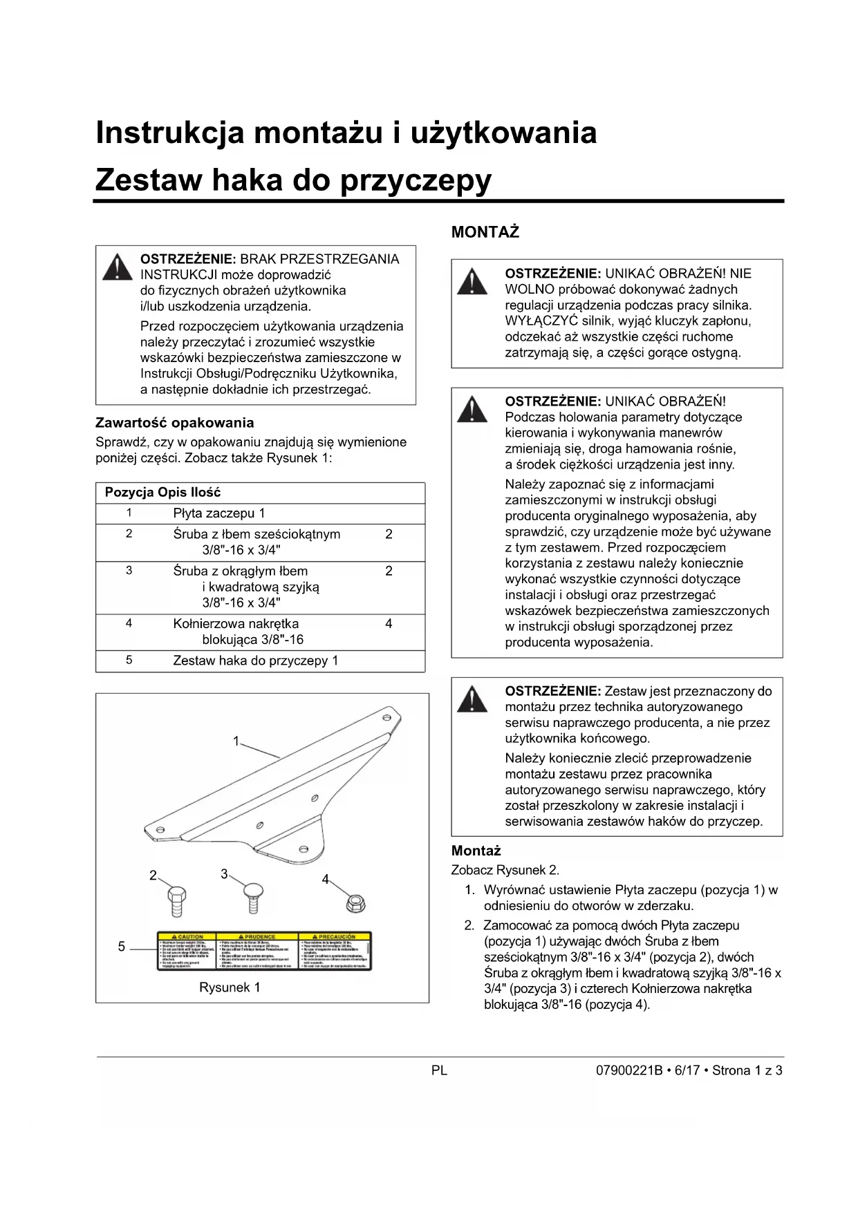 UWAGA: Hak jest przyznaczenia do holowania wyposazenia z obciazenia impedowiadajycym masie wsięgnika wynoszȩje 13.6 kg (30 funtów) oraz wydajnosci holowania 136 kg (300 funtów). Naleźzy zapoznać są informacjami zamieszczonymi w instrukcj obshgli producenta oryginalnégo wyposazenia, aby sprawdzić,czy urzadzenia要去ć uzywane z tym zestawem. Przed Rozpoczeciem korzystania z zestawu naleź koniecznie wykonac wszystkie czynnosci dotyczść instalacji i obshgli oraz przyestrzegać wskazowej bezpieczność zamieszczonymych w instrukcj obshgli sporzadzonej przyez producenta wyposazenia.