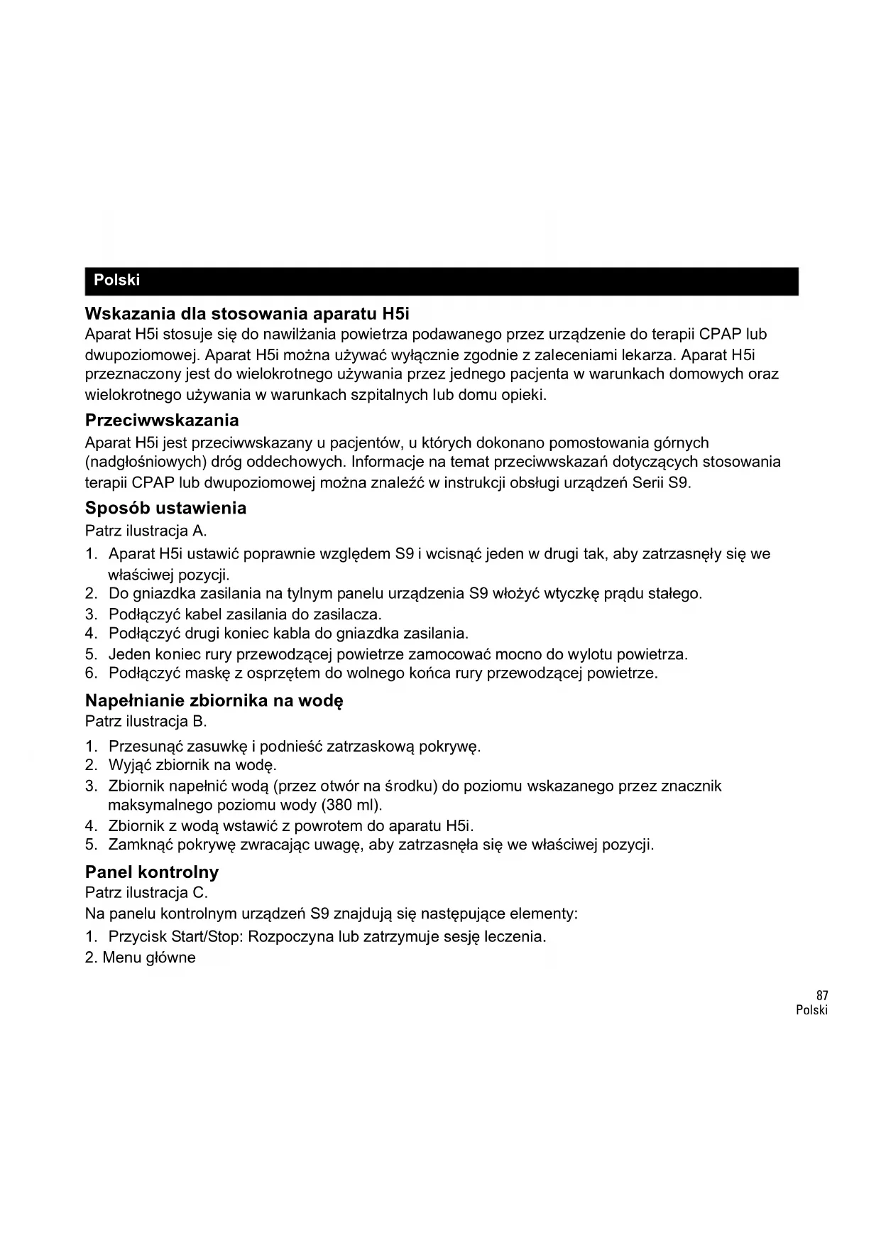 Wskazania dla stosowania aparatu H5i Aparat H5i stosuje się do nawilżania powietrza podawanego przez urządzenie do terapii CPAP lub dwupoziomowej. Aparat H5i można używać wyłącznie zgodnie z zaleceniami lekarza. Aparat H5i przeznaczony jest do wielokrotnego używania przez jednego pacjenta w warunkach domowych oraz wielokrotnego używania w warunkach szpitalnych lub domu opieki. Przeciwwskazania Aparat H5i jest przeciwwskazany u pacjentów, u których dokonano pomostowania górnych (nadgłośniowych) dróg oddechowych. Informacje na temat przeciwwskazań dotyczących stosowania terapii CPAP lub dwupoziomowej można znaleźć w instrukcji obsługi urządzeń Serii S9. Sposób ustawienia Patrz ilustracja A.