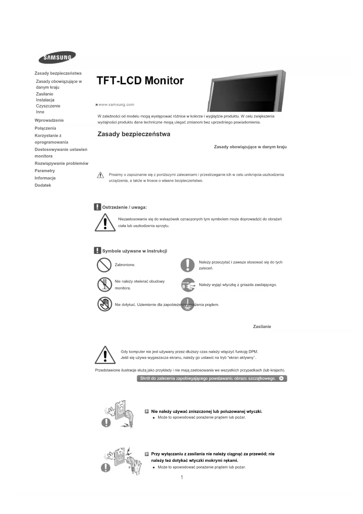Moe to spowodowa poraenie prdem lub poar. Zasady bezpieczestwa Zasady obowizujce w danym kraju Zasilanie Instalacja Czyszczenie Inne Wprowadzenie Poczenia Korzystanie z oprogramowania Dostosowywanie ustawie monitora Rozwizywanie problemów Parametry Informacje Dodatek