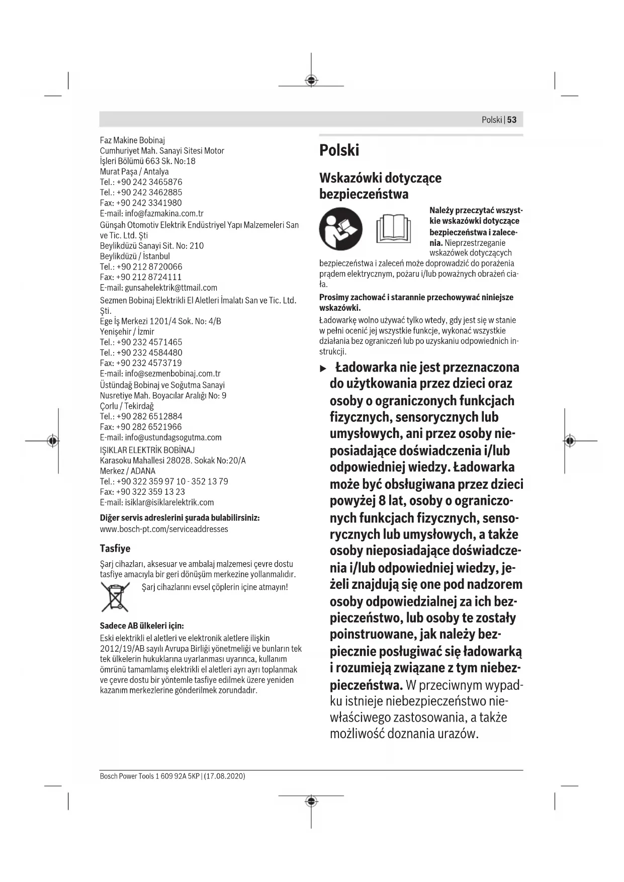 Karasoku Mahallesi 28028. Sokak No:20/A Merkez / ADANA Tel.: +903223599710 -3521379 Fax: +903223591323 E-mail: isiklar@isiklarelektrik.com Diğer servis adreslerini şurada bulabilirsiniz: www.bosch-pt.com/serviceaddresses Tasfiye Şarj cihazları, aksesuar ve ambalaj malzemesi çevre dostu tasfiye amacıyla bir geri dönüşüm merkezine yollanmalıdır. Şarj cihazlarını evsel çöplerin içine atmayın! Sadece AB ülkeleri için: Eski elektrikli el aletleri ve elektronik aletlere ilişkin 2012/19/AB sayılı Avrupa Birliği yönetmeliği ve bunların tek tek ülkelerin hukuklarına uyarlanması uyarınca, kullanım ömrünü tamamlamış elektrikli el aletleri ayrı ayrı toplanmak ve çevre dostu bir yöntemle tasfiye edilmek üzere yeniden kazanım merkezlerine gönderilmek zorundadır. Polski Wskazówki dotyczące bezpieczeństwa Należy przeczytać wszyst- kie wskazówki dotyczące bezpieczeństwa i zalece- nia. Nieprzestrzeganie wskazówek dotyczących bezpieczeństwa izaleceń może doprowadzić do porażenia prądem elektrycznym, pożaru i/lub poważnych obrażeń cia- ła. Prosimy zachować i starannie przechowywać niniejsze wskazówki. Ładowarkę wolno używać tylko wtedy, gdy jest się w stanie w pełni ocenić jej wszystkie funkcje, wykonać wszystkie działania bez ograniczeń lub po uzyskaniu odpowiednich in- strukcji. u Ładowarka nie jest przeznaczona do użytkowania przez dzieci oraz osoby o ograniczonych funkcjach fizycznych, sensorycznych lub umysłowych, ani przez osoby nie- posiadające doświadczenia i/lub odpowiedniej wiedzy. Ładowarka może być obsługiwana przez dzieci powyżej 8 lat, osoby o ograniczo- nych funkcjach fizycznych, senso- rycznych lub umysłowych, a także osoby nieposiadające doświadcze- nia i/lub odpowiedniej wiedzy, je- żeli znajdują się one pod nadzorem osoby odpowiedzialnej za ich bez- pieczeństwo, lub osoby te zostały poinstruowane, jak należy bez- piecznie posługiwać się ładowarką i rozumieją związane z tym niebez- pieczeństwa. W przeciwnym wypad- ku istnieje niebezpieczeństwo nie- właściwego zastosowania, a także możliwość doznania urazów. Bosch Power Tools 1 609 92A 5KP | (17.08.2020)54 | Polski u Podczas użytkowania, czyszczenia lub prac konserwacyjnych dzieci powinny znajdować się pod nadzo- rem. Tylko w ten sposób można za- gwarantować, że dzieci nie będą się bawiły ładowarką. u Wolno ładować wyłącznie akumu- latory litowo-jonowe firmy Bosch o pojemności nie mniejszej niż 1,3 Ah (od 4 ogniw). Napięcie akumu- latora musi być dostosowane do napięcia ładowania w ładowarce. Nie wolno ładować baterii jednora- zowych. W przeciwnym wypadku ist- nieje zagrożenie pożarem lub wybu- chem. Chronić ładowarkę przed deszczem i wilgocią. Przedostanie się wody do urządzenia elektrycznego zwięk- sza ryzyko porażenia prądem. u Ładowarkę należy utrzymywać w czystości. Zanie- czyszczenia mogą spowodować porażenie prądem elek- trycznym. u Przed każdym użytkowaniem należy skontrolować ła- dowarkę, przewód i wtyczkę. W razie stwierdzenia uszkodzeń nie wolno użytkować ładowarki. Nie wolno samodzielnie otwierać ładowarki, a naprawę tego urządzenia należy zlecać jedynie wykwalifikowanym fachowcom i wykonać ją tylko przy użyciu oryginal- nych części zamiennych. Uszkodzone ładowarki, prze- wody i wtyczki zwiększają ryzyko porażenia prądem. u Nie korzystać z ładowarki umieszczonej na łatwopal- nym podłożu (np. papier, tekstylia itp.) ani w sąsiedz- twie łatwopalnych substancji. Ze względu na wzrost temperatury ładowarki podczas procesu ładowania ist- nieje niebezpieczeństwo pożaru. u Nie wolno zasłaniać szczelin wentylacyjnych ładowar- ki. Ładowarka może się przegrzać i przestać funkcjono- wać prawidłowo. u Akumulatory należy ładować tylko w ładowarkach o parametrach określonych przez producenta. W przy- padku użycia ładowarki, przystosowanej do ładowania określonego rodzaju akumulatorów, w sposób niezgodny z przeznaczeniem, istnieje niebezpieczeństwo pożaru. u W przypadku uszkodzenia i niewłaściwego użytkowa- nia akumulatora może dojść do wydzielenia się gazów. Należy zadbać o dopływ świeżego powietrza, a w przy- padku wystąpienia dolegliwości skontaktować się z leka- rzem.Opary mogą podrażnić drogi oddechowe. u Przechowywanie lub użytkowanie akumulatora w nie- odpowiednich warunkach może spowodować wyciek elektrolitu. Należy unikać kontaktu z elektrolitem, a w razie przypadkowego kontaktu, przepłukać skórę wo- dą. W przypadku dostania się elektrolitu do oczu, na- leży dodatkowo zasięgnąć porady lekarza. Elektrolit wyciekający z akumulatora może spowodować podrażnie- nie skóry lub oparzenia. Opis produktu i jego zastosowania Użycie zgodne z przeznaczeniem Ładowarka jest przeznaczona do ładowania akumulatorów Li-ion firmy Bosch. Przedstawione graficznie komponenty Numeracja przedstawionych graficznie komponentów odno- si się do schematu ładowarki na stronach graficznych. (1) Akumulator