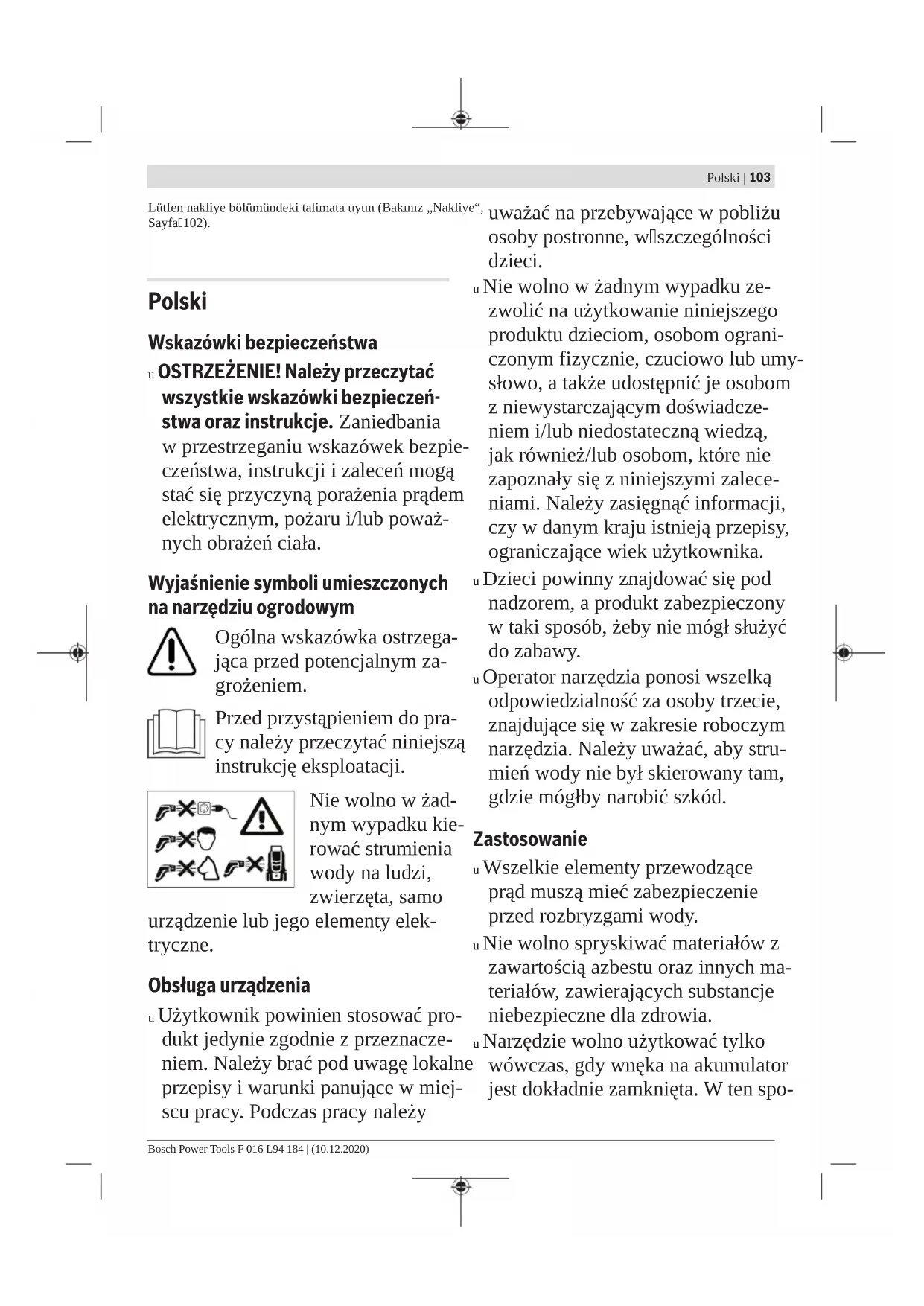 Karasoku Mahallesi 28028. Sokak No:20/A Merkez / ADANA Tel.: +903223599710 -3521379 Fax: +903223591323 E-mail: isiklar@isiklarelektrik.com Diğer servis adreslerini şurada bulabilirsiniz: www.bosch-pt.com/serviceaddresses Nakliye Alet içindeki lityum iyon (Li-Ionen) aküler tehlikeli madde taşıma yönetmeliği hükümlerine tabidir. Aküler başka bir yükümlülük olmaksızın kullanıcı tarafından caddeler üzerinde taşınabilir. Üçüncü kişiler eliyle yollanma durumunda (örneğin hava yolu ile veya nakliye şirketleri ile) paketleme ve etiketlemeye ilişkin özel hükümlere uyulmalıdır. Gönderi paketlenirken bir tehlikeli madde uzmanından yardım alınmalıdır. Aküleri sadece ve ancak gövdelerinde hasar yoksa gönderin. Açık kontakları kapatın ve aküyü ambalaj içinde hareket etmeyecek biçimde paketleyin. Lütfen olası ek ulusal yönetmelik hükümlerine de uyun. Tasfiye Ürünler, aküler, aksesuar ve ambalaj malzemesi çevre dostu yeniden kazanım merkezine gönderilmek zorundadır. ürünleri ve aküleri/bataryaları evsel çöplerin içine atmayın! Sadece AB ülkeleri için: 2012/19/EU yönetmeliği uyarınca kullanım ömrünü tamamlamış ürünler ve 2006/66/EC yönetmeliği uyarınca arızalı veya kullanım ömrünü tamamlamış aküler/ bataryalar ayrı ayrı toplanmak ve çevre dostu tasfiye için bir geri dönüşüm merkezine gönderilmek zorundadır. Aküler/bataryalar: Lityum iyon: F 016 L94 184 | (10.12.2020) Bosch Power ToolsPolski | 103 Lütfen nakliye bölümündeki talimata uyun (Bakınız „Nakliye“, Sayfa102). Polski Wskazówki bezpieczeństwa u OSTRZEŻENIE! Należy przeczytać wszystkie wskazówki bezpieczeń- stwa oraz instrukcje. Zaniedbania w przestrzeganiu wskazówek bezpie- czeństwa, instrukcji i zaleceń mogą stać się przyczyną porażenia prądem elektrycznym, pożaru i/lub poważ- nych obrażeń ciała. Wyjaśnienie symboli umieszczonych na narzędziu ogrodowym Ogólna wskazówka ostrzega- jąca przed potencjalnym za- grożeniem. Przed przystąpieniem do pra- cy należy przeczytać niniejszą instrukcję eksploatacji. Nie wolno w żad- nym wypadku kie- rować strumienia wody na ludzi, zwierzęta, samo urządzenie lub jego elementy elek- tryczne. Obsługa urządzenia u Użytkownik powinien stosować pro- dukt jedynie zgodnie z przeznacze- niem. Należy brać pod uwagę lokalne przepisy i warunki panujące w miej- scu pracy. Podczas pracy należy uważać na przebywające w pobliżu osoby postronne, wszczególności dzieci. u Nie wolno w żadnym wypadku ze- zwolić na użytkowanie niniejszego produktu dzieciom, osobom ograni- czonym fizycznie, czuciowo lub umy- słowo, a także udostępnić je osobom z niewystarczającym doświadcze- niem i/lub niedostateczną wiedzą, jak również/lub osobom, które nie zapoznały się z niniejszymi zalece- niami. Należy zasięgnąć informacji, czy w danym kraju istnieją przepisy, ograniczające wiek użytkownika. u Dzieci powinny znajdować się pod nadzorem, a produkt zabezpieczony w taki sposób, żeby nie mógł służyć do zabawy. u Operator narzędzia ponosi wszelką odpowiedzialność za osoby trzecie, znajdujące się w zakresie roboczym narzędzia. Należy uważać, aby stru- mień wody nie był skierowany tam, gdzie mógłby narobić szkód. Zastosowanie u Wszelkie elementy przewodzące prąd muszą mieć zabezpieczenie przed rozbryzgami wody. u Nie wolno spryskiwać materiałów z zawartością azbestu oraz innych ma- teriałów, zawierających substancje niebezpieczne dla zdrowia. u Narzędzie wolno użytkować tylko wówczas, gdy wnęka na akumulator jest dokładnie zamknięta. W ten spo- Bosch Power Tools F 016 L94 184 | (10.12.2020)104 | Polski sób akumulator nie będzie narażony na rozbryzgi wody. u Przed rozpoczęciem pracy należy skontrolować stan techniczny urzą- dzenia i jego osprzętu, a także sprawdzić je pod względem bezpie- czeństwa pracy. Jeżeli urządzenie nie znajduje się w technicznie niena- gannym stanie, nie może być do- puszczone do eksploatacji. u Urządzenie należy umieścić na stabil- nym podłożu. u Niedopuszczalne jest stosowanie cieczy na bazie rozpuszczalników, nierozcieńczonych kwasów, acetonu lub rozpuszczalników (m.in. benzy- ny, rozcieńczalników farb lub oleju opałowego), gdyż ich pary są skraj- nie łatwopalne, wybuchowe i tok- syczne. u Nie wolno nigdy napełniać zbiornika na wodę, gdy filtr jest uszkodzony, lub gdy go w ogóle nie ma. u Nie wolno w żaden sposób modyfi- kować narzędzia. Niedopuszczalne przeróbki mogą wpłynąć na obniże- nie bezpieczeństwa narzędzia, obni- żyć wydajność, a także zwiększyć szumy i wibracje. u Nie wolno w żadnym wypadku kiero- wać strumienia wody na twarze lu- dzi, ani pyski zwierząt. u Nie wolno zanurzać narzędzia w wo- dzie, w celu napełnienia zbiornika. u Pod wpływem wysokiego ciśnienia może dojść do odbicia obiektów. W razie potrzeby należy nosić podczas pracy odpowiednie osobiste wypo- sażenie ochronne, na przykład okula- ry ochronne. u Do napełnienia zbiornika należy sto- sować wyłącznie świeżą (nie zawie- rającą soli) wodę. Wskazówki dotyczące optymalnego obchodzenia się z akumulatorem u Nie otwierać akumulatora. Istnieje niebezpieczeństwo zwarcia. Akumulator należy chronić przed wysokimi temperaturami (np. przed stałym nasło- necznieniem), ogniem, wodą oraz wilgocią. Istnieje zagrożenie wybuchem. u Uszkodzenie akumulatora lub zastosowanie go w spo- sób niezgodny z przeznaczeniem może doprowadzić do wystąpienia niebezpiecznych oparów. Należy za- dbać o dopływ świeżego powietrza, a w razie wystąpienia dolegliwości skonsultować się z lekarzem. Opary mogą uszkodzić drogi oddechowe. u Akumulator należy stosować wyłącznie w urządze- niach producenta. Tylko w ten sposób można ochronić akumulator przed niebezpiecznym dla niego przeciąże- niem. u Ostre przedmioty, takie jak gwoździe lub śrubokr