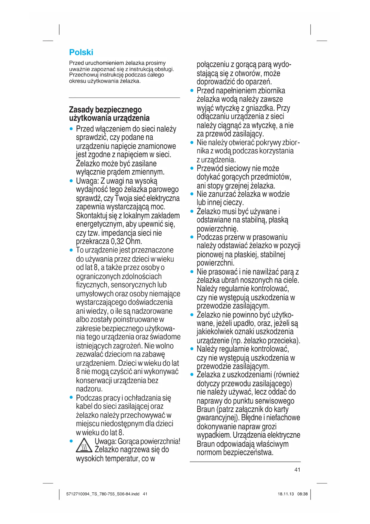 ˚elazka z uszkodzeniami (równie˝ dotyczy przewodu zasilajàcego) nie nale˝y u˝ywaç, lecz oddaç do naprawy do punktu serwisowego Braun (patrz za∏àcznik do karty gwarancyjnej). B∏´dne i niefachowe dokonywanie napraw grozi wypadkiem. Urzàdzenia elektryczne Braun odpowiadajà w∏aÊciwym normom bezpieczeƒstwa. 5712710094_TS_780-755_S06-84.indd 415712710094_TS_780-755_S06-84.indd 41 18.11.13 08:3818.11.13 08:3842 A Opis urzàdzenia 1 Otwory wyrzutu pary (z przodu ˝elazka) 2 Dysza spryskiwacza 3 Otwór wlewowy z zamkni´ciem 4 Przycisk wyrzutu pary (Precision shot) 5 Przycisk spryskiwacza (spray) 6 Pokr´t∏o regulacji iloÊci pary 7 Pokr´t∏o regulacji temperatury 8 Lampka kontrolna temperatury 9 Lampka kontrolna automatycznego wy∏àcznika («auto-off») 10 Podstawa ˝elazka 11 Nak∏adka Ochronna Protector (Textile Protector) 12 Mi´kka Nak∏adka Ochronna Soft Protector (Soft Textile Protector) B Praktyczne wskazówki przed rozpocz´ciem prasowania Do nape∏niania ˝elazka mo˝na stosowaç wod´ z kranu. W przypadku bardzo twardej wody zalecamy stosowanie mieszanki: 50% wody z kranu i 50% wody destylowanej. Zbiornik na wod´ nale˝y nape∏niç do poziomu oznaczonego «max». Nie u˝ywaç samej wody destylowanej. Nie dodawaç ˝adnych preparatów, np. krochmalu. Nie u˝ywaj ponownie, przetworzonej przez urzàdzenie wody.