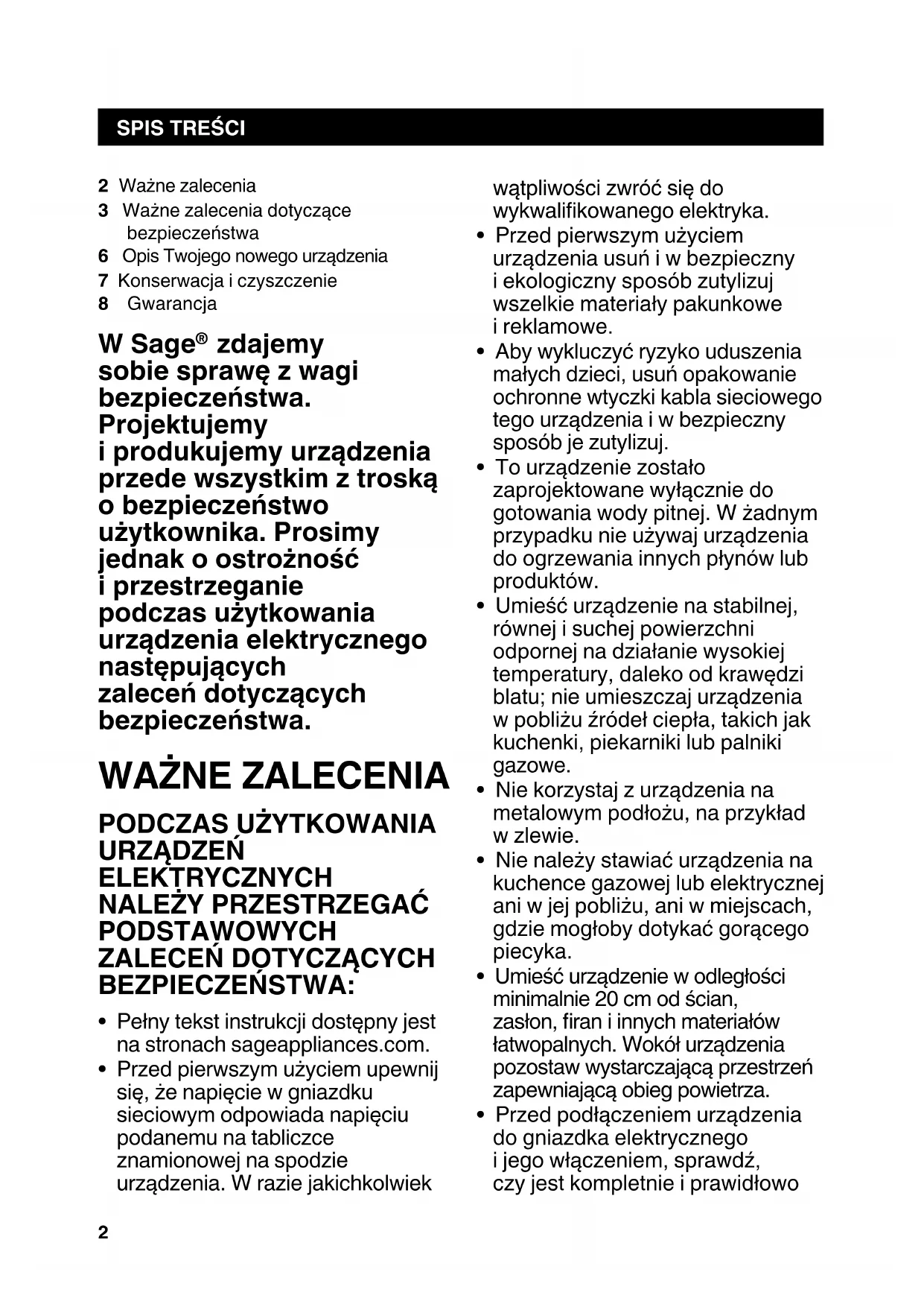 - Pełny tekst instrukcji dostępny jest na stronach sageappliances.com.
