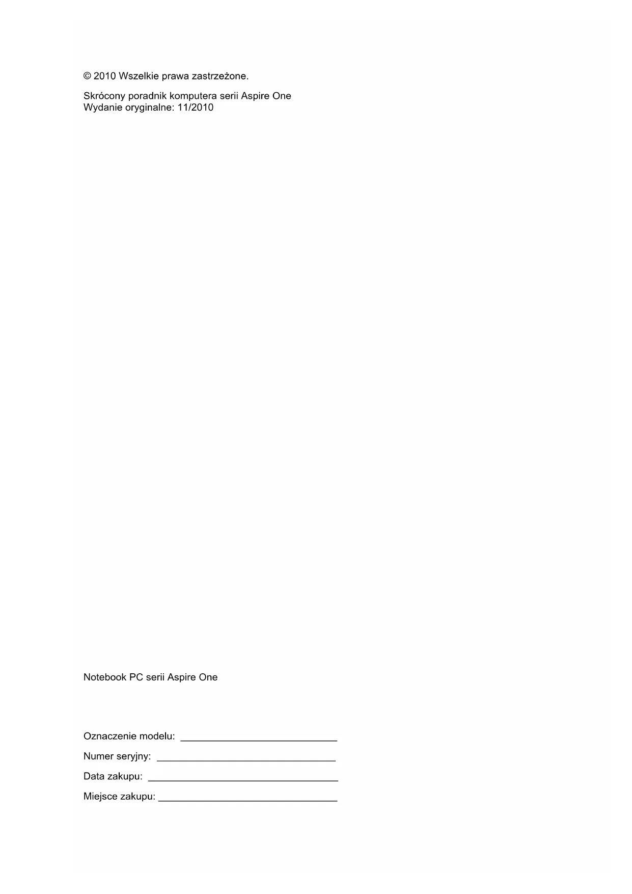 - чя: 20% 80%Komputer serii Aspire One Skrócony poradnikOznaczenie modelu: ____________________________ Numer seryjny: ________________________________ Data zakupu: __________________________________ Miejsce zakupu: ________________________________ © 2010 Wszelkie prawa zastrzeżone. Skrócony poradnik komputera serii Aspire One Wydanie oryginalne: 11/2010 Notebook PC serii Aspire One3 Na początek Dziękujemy za wybranie notebooka PC serii Acer dla celów realizacji potrzeb w zakresie mobilnego przetwarzania. Instrukcje Aby pomóc w korzystaniu z komputera Acer, opracowaliśmy zestaw instrukcji: Jako pierwszy można wymienić poster Dla początkujących..., który pomoże użytkownikom rozpocząć ustawianie komputera. Ogólnego podręcznika użytkownika urządzenia serii Aspire One zawiera przydatne informacje dotyczące wszystkich modeli serii Aspire One. Obejmuje podstawowe zagadnienia, takie jak używanie klawiatury, dźwięki itd. Należy pamiętać, że Ogólny podręcznik użytkownika oraz AcerSystem User Guide, o którym mowa poniżej, odnoszą się czasami do funkcji lub elementów tylko niektórych modeli serii, które nie muszą występować w zakupionym modelu. W takich przypadkach użyto oznaczenia „tylko w niektórych modelach”. Skrócony poradnik przedstawia podstawowe właściwości i funkcje nowego komputera. Aby uzyskać więcej informacji o tym, w jaki sposób nowy komputer może pomóc Ci być bardziej produktywnym, zapoznaj się z AcerSystem User Guide. Przewodnik ten zawiera szczegółowe informacje dotyczące takich tematów, jak narzędzia systemowe, odzyskiwanie danych, opcje rozszerzeń oraz rozwiązywanie problemów. Oprócz nich, zawiera także informacje na temat gwarancji oraz informacje dotyczące bezpieczeństwa pracy z komputerem przenośnym. Jest on dostępny w formie elektronicznej jako dokument w formacie Portable Document Format (PDF) i jest dostarczany jako zapisany w Twoim notebooku. Wykonaj poniższe czynności, aby uzyskać do niego dostęp: 1 Kliknij Start > Wszystkie programy > AcerSystem. 2 Kliknij AcerSystem User Guide. Uwaga: Aby można było przeglądać ten plik, konieczne jest zainstalowanie programu Adobe Reader. Jeżeli w komputerze nie zainstalowano programu Adobe Reader, kliknięcie AcerSystem User Guide spowoduje uruchomienie instalatora programu Adobe Reader. W celu dokończenia instalacji należy wykonać instrukcje wyświetlane na ekranie. Instrukcje dotyczące używania programu Adobe Reader, znajdują się w menu Pomocy i obsługi technicznej.4 Polski Zapoznanie z notebookiem Acer Po ustawieniu komputera jak to przedstawiono na ilustracji w plakacie instalacyjnym, przyjrzyjmy się nowemu notebookowi Acer. Widok z góry # Ikona Element Opis 1Mikrofon Wewnętrzny mikrofon do rejestrowania dźwięku. 2 Ekran wyświetlacza Nazywany jest także wyświetlaczem ciekłokrystalicznym (Liquid-Crystal Display; LCD), wyświetla informacje wyjściowe komputera (konfiguracja może być różna w zależności od modelu).
