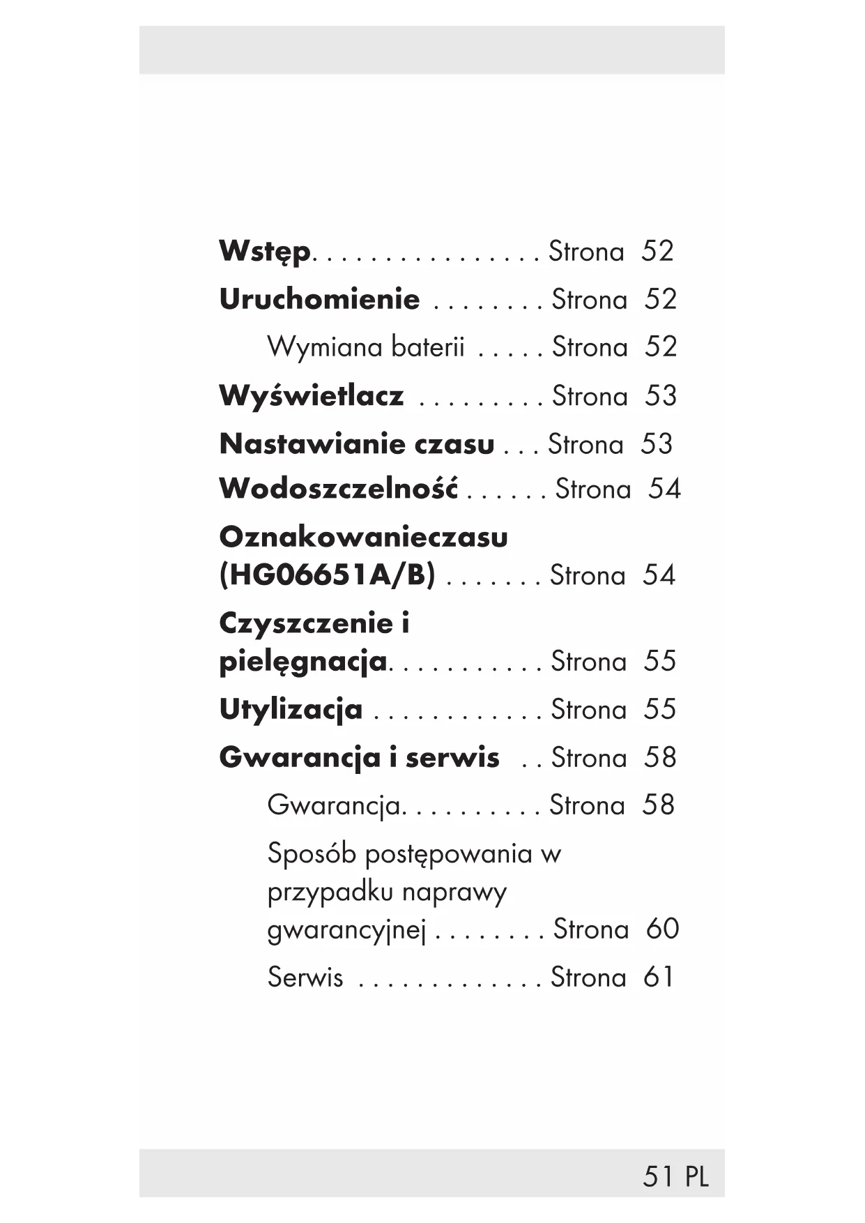 w kierunku przeciwnym do ruchu wskazówek zegara, aby zaznaczyć początek pomiaru czasu. Czyszczenie i pielęgnacja Niniejszy produkt należy czyścić jedynie zewnętrznie za pomocą miękkiej suchej ścierki. Utylizacja Opakowanie wykonane jest z materiałów przyjaznych dla środowiska, które można przekazać do utylizacji w lokalnym punkcie przetwarzania surowców wtórnych.56 PL Przy segregowaniu odpadów prosimy zwrócić uwagę na oznakowanie materiałów opakowaniowych, oznaczone są one skrótami (a) i numerami (b) o następującym znaczeniu: 1 – 7: Tworzywa sztuczne / 20 – 22: Papier i tektura / 80 – 98: Materiały kompozytowe. Produkt i materiał opakowania nadają się do ponownego przetworzenia, należy je zutylizować osobno w celu lepszego przetworzenia odpadów. Logo Triman jest ważne tylko dla Francji.57 PL Informacji na temat możliwości utylizacji wyeksploatowanego produktu udziela urząd gminy lub miasta. Z uwagi na ochronę środowiska nie wyrzucać urządzenia po zakończeniu eksploatacji do odpadów domowych, lecz prawidłowo zutylizować. Informacji o punktach zbiorczych i ich godzinach otwarcia udziela odpowiedni urząd. Uszkodzone lub zużyte baterie / akumulatory muszą być poddane recyklingowi zgodnie z dyrektywą 2006/66/WE i jej zmianami. Oddać baterie / akumulatory i / lub produkt w dostępnych punktach zbiórki.58 PL Niewłaściwa utylizacja baterii / akumulatorów stwarza zagrożenie dla środowiska naturalnego! Baterii / akumulatorów nie należy wyrzucać razem z odpadami domowymi. Mogą one zawierać szkodliwe metale ciężkie i należy je traktować jak odpady specjalne. Symbole chemiczne metali ciężkich są następujące: Cd = kadm, Hg = rtęć, Pb = ołów. Dlatego też zużyte baterie / akumulatory należy przekazywać do komunalnych punktów gromadzenia odpadów niebezpiecznych. P Gwarancja i serwis P Gwarancja Produkt wyprodukowano według wysokich standardów jakości i poddano skrupulatnej kontroli przed wysyłką. W przypadku wad produktu nabywcy przysługują ustawowe prawa. Gwarancja nie ogranicza59 PL ustawowych praw nabywcy produktu. Produkt objęte jest 3 gwarancją, licząc od daty zakupu. Gwarancja wygasa w razie zawinionego przez użytkownika uszkodzenia produktu, niewłaściwego użycia lub konserwacji. W przypadku wystąpienia w ciągu 3 lat od daty zakupu wad materiałowych lub fabrycznych, dokonujemy – według własnej oceny – bezpłatnej naprawy lub wymiany produktu. Świadczenie gwarancyjne obejmuje wady materiałowe i fabryczne. Gwarancja nie obejmuje części produktu ulegających normalnemu zużyciu, uznawanych za części zużywalne (np. baterie) oraz uszkodzeń części łamliwych, np. przełączników, akumulatorów lub wykonanych ze szkła. Zgodnie z Kodeksem Cywilnym art. 581 §1 wraz z wymianą urządzenia lub ważnej części czas gwarancji rozpoczyna się na nowo.60 PL Gwarancja wyłącza także spadek wodoszczelności. Stan wodoszczelności nie jest cechą stałą i dlatego powinien podlegać regularnej konserwacji. Proszę uwzględnić, że poprzez otwieranie i naprawę przez osoby nieupoważnione wygasają roszczenia gwarancyjne. P Sposób postępowania w przypadku naprawy gwarancyjnej Aby zapewnić szybkie rozpatrzenie Państwa wniosku, prosimy stosować się do następujących wskazówek: Przed skontaktowaniem się z działem serwisowym należy przygotować paragon i numer artykułu (np. IAN 123456_7890) jako dowód zakupu. Numery artykułów można znaleźć na tabliczce znamionowe, na grawerunku, na stronie tytułowej jego instrukcji (na dole po lewej stronie) lub jako naklejkę na stronie odwrotnej lub spodniej. W razie wystąpienia błędów w działaniu lub innych wad, należy61 PL skontaktować się najpierw z wymienionym poniżej działem serwisowym telefonicznie lub pocztą elektroniczną. Produkt uznany za uszkodzony można następnie z dołączeniem dowodu zakupu (paragonu) i podaniem, na czym polega wada i kiedy wystąpiła, przesłać bezpłatnie na podany Państwu adres serwisu. P Serwis Serwis Polska Tel.: 0080 04911946 E-Mail: owim@lidl.pl62 CZ Úvod.................Strana 63 Příprava k použití ....Strana 63 Výměna baterie ......Strana 63 Zobrazení ............Strana 64 Nastaveníčasu .......Strana 64 Vodotěsnost..........Strana 65 Označení času (HG06651A/B) .......Strana 65 Čistění a ošetřování...Strana 66 Zlikvidování..........Strana 66 Záruka a servis ......Strana 68 Záruka .............Strana 68 Postup v případě uplatňování záruky....Strana 70 Servis ..............Strana 7163 CZ