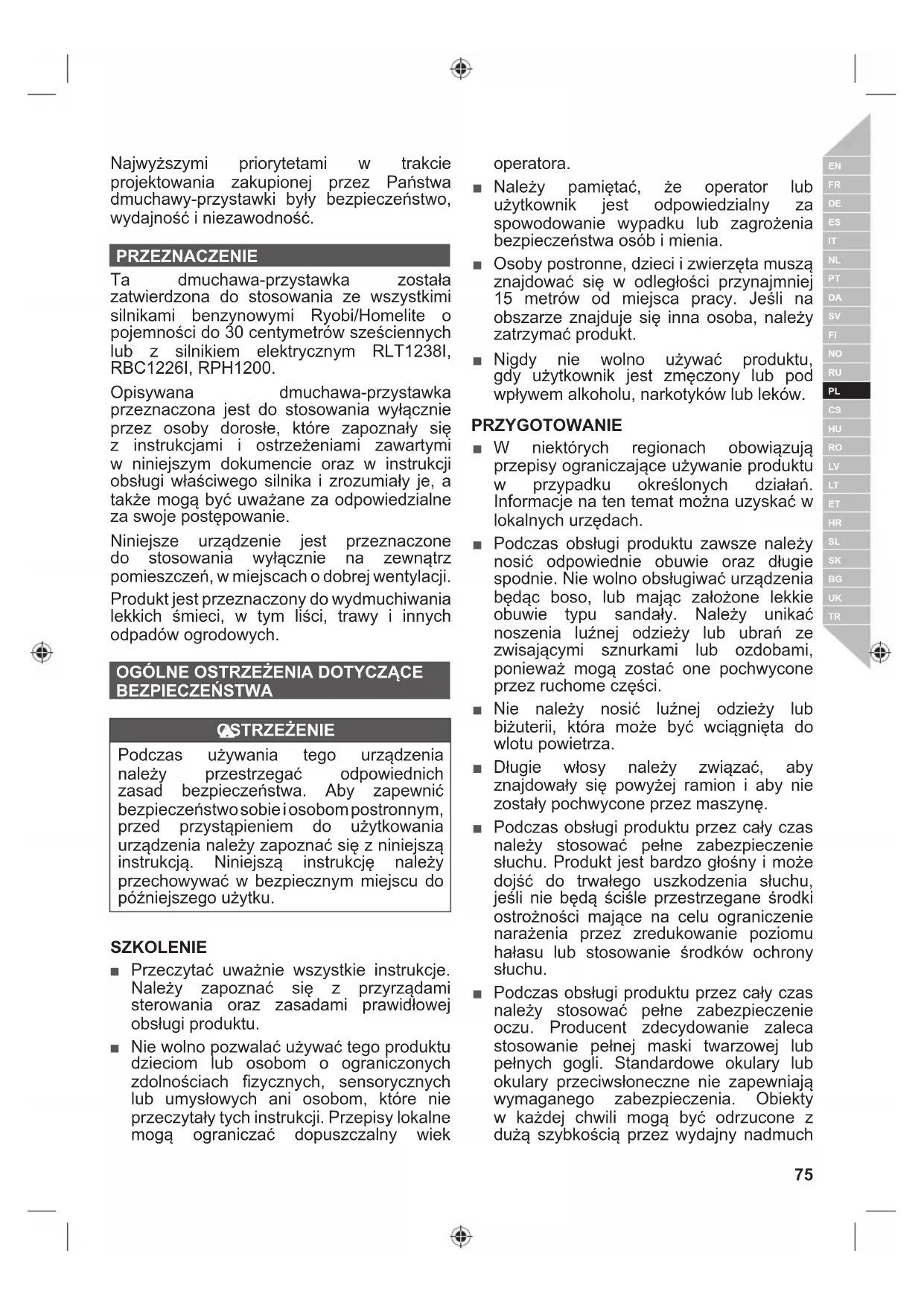 Najwyższymi priorytetami w trakcie projektowania zakupionej przez Państwa dmuchawy-przystawki były bezpieczeństwo, wydajność i niezawodność. PRZEZNACZENIE Ta dmuchawa-przystawka została zatwierdzona do stosowania ze wszystkimi silnikami benzynowymi Ryobi/Homelite o pojemności do 30 centymetrów sześciennych lub z silnikiem elektrycznym RLT1238I, RBC1226I, RPH1200. Opisywana dmuchawa-przystawka przeznaczona jest do stosowania wyłącznie przez osoby dorosłe, które zapoznały się z instrukcjami i ostrzeżeniami zawartymi w niniejszym dokumencie oraz w instrukcji obsługi właściwego silnika i zrozumiały je, a także mogą być uważane za odpowiedzialne za swoje postępowanie. Niniejsze urządzenie jest przeznaczone do stosowania wyłącznie na zewnątrz pomieszczeń, w miejscach o dobrej wentylacji. Produkt jest przeznaczony do wydmuchiwania lekkich śmieci, w tym liści, trawy i innych odpadów ogrodowych.