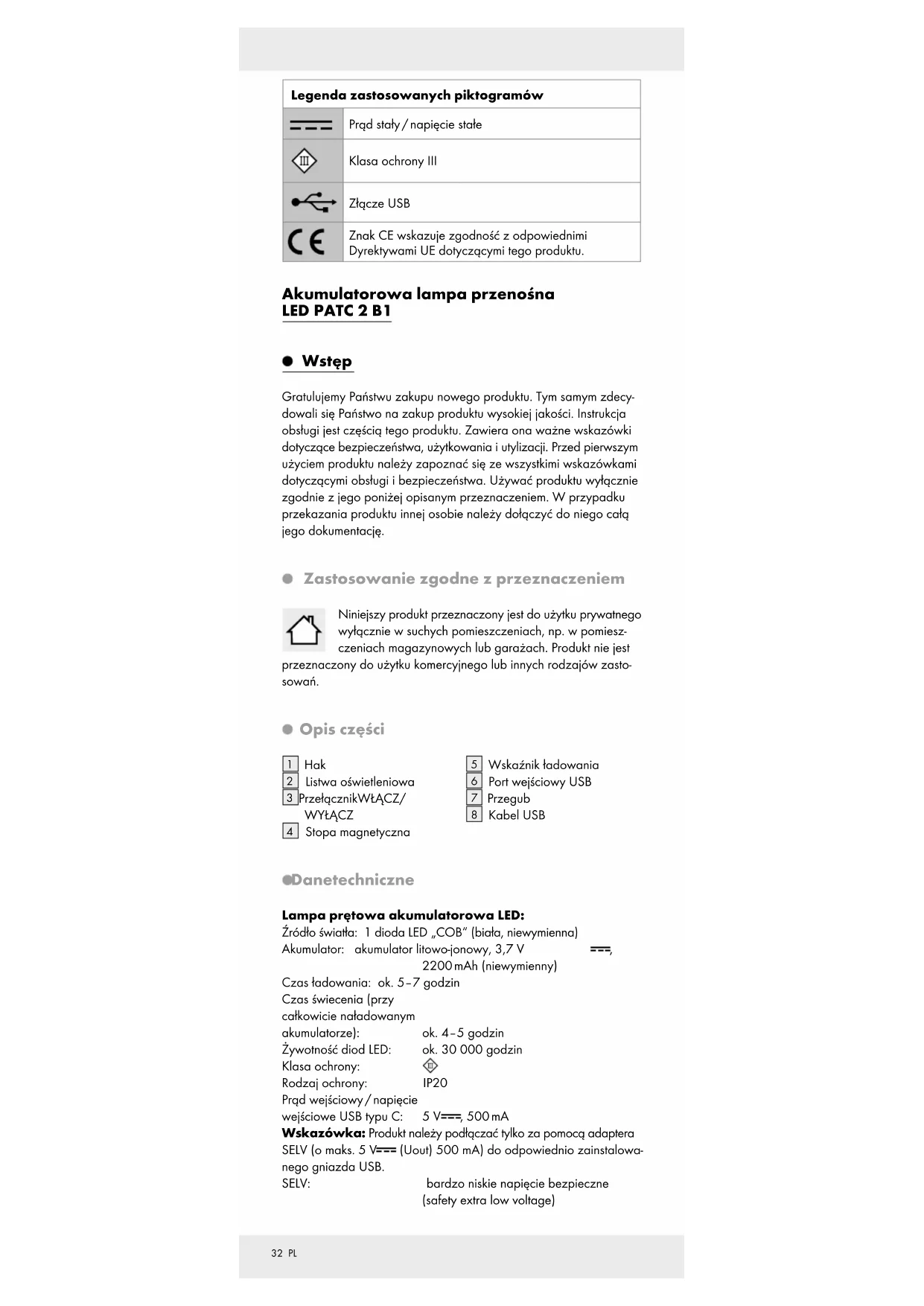 2200 mAh (niewymienny) Czas ładowania: ok. 5–7 godzin Czas świecenia (przy całkowicie naładowanym akumulatorze): ok. 4–5 godzin Żywotność diod LED: ok. 30 000 godzin Klasa ochrony: Rodzaj ochrony: IP20 Prąd wejściowy / napięcie wejściowe USB typu C: 5 V , 500 mA Wskazówka: Produkt należy podłączać tylko za pomocą adaptera SELV (o maks. 5 V (Uout) 500 mA) do odpowiednio zainstalowa- nego gniazda USB. SELV: bardzo niskie napięcie bezpieczne (safety extra low voltage)33 PL Zawartość 1 lampa prętowa akumulatorowa LED 1 kabel USB 1 instrukcja obsługi Wskazówki bezpieczeństwa Przed pierwszym użyciem produktu należy zapoznać się ze wszyst- kimi wskazówkami dotyczącymi obsługi i bezpieczeństwa! W przy- padku przekazania produktu innej osobie należy dołączyć do niego całą dokumentację!