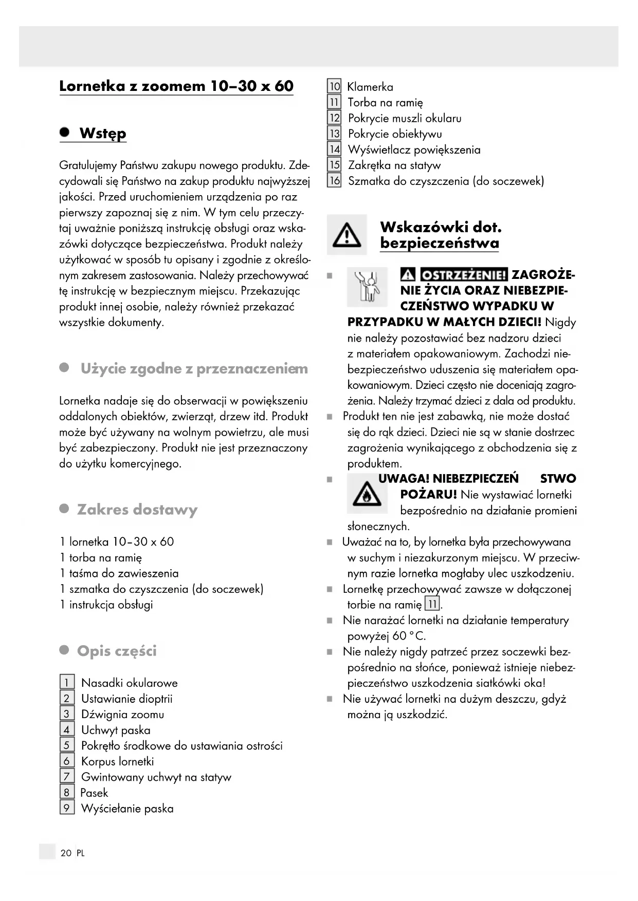 Zakres dostawy 1 lornetka 10–30 x 60 1 torba na ramię 1 taśma do zawieszenia 1 szmatka do czyszczenia (do soczewek) 1 instrukcja obsługi