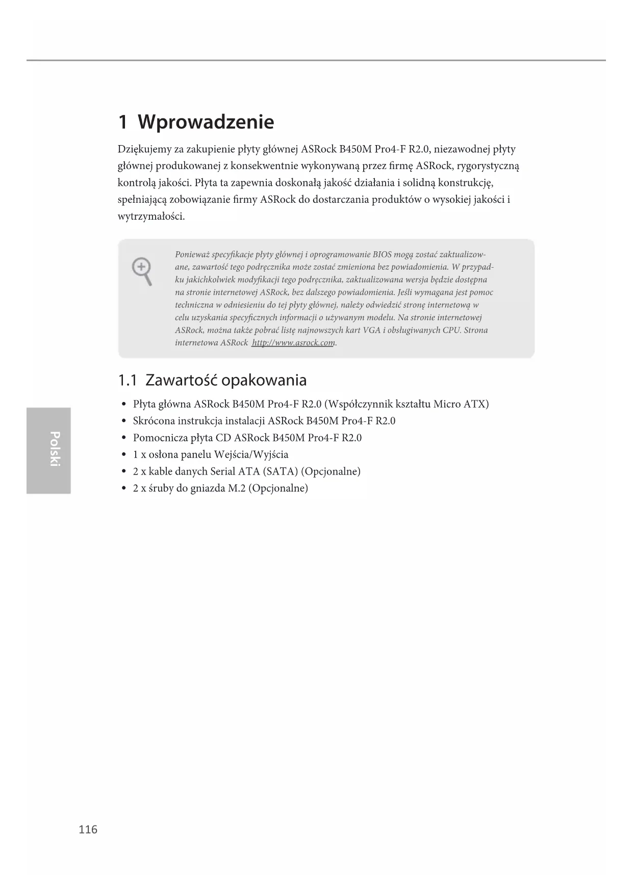 2 x śruby do gniazda M.2 (Opcjonalne) Ponieważ specykacje płyty głównej i oprogramowanie BIOS mogą zostać zaktualizow-ane, zawartość tego podręcznika może zostać zmieniona bez powiadomienia. W przypad-ku jakichkolwiek modykacji tego podręcznika, zaktualizowana wersja będzie dostępna na stronie internetowej ASRock, bez dalszego powiadomienia. Jeśli wymagana jest pomoc techniczna w odniesieniu do tej płyty głównej, należy odwiedzić stronę internetową w celu uzyskania specycznych informacji o używanym modelu. Na stronie internetowej ASRock, można także pobrać listę najnowszych kart VGA i obsługiwanych CPU. Strona internetowa ASRock http://www.asrock.com.117 Polski B450M Pro4-F R2.0