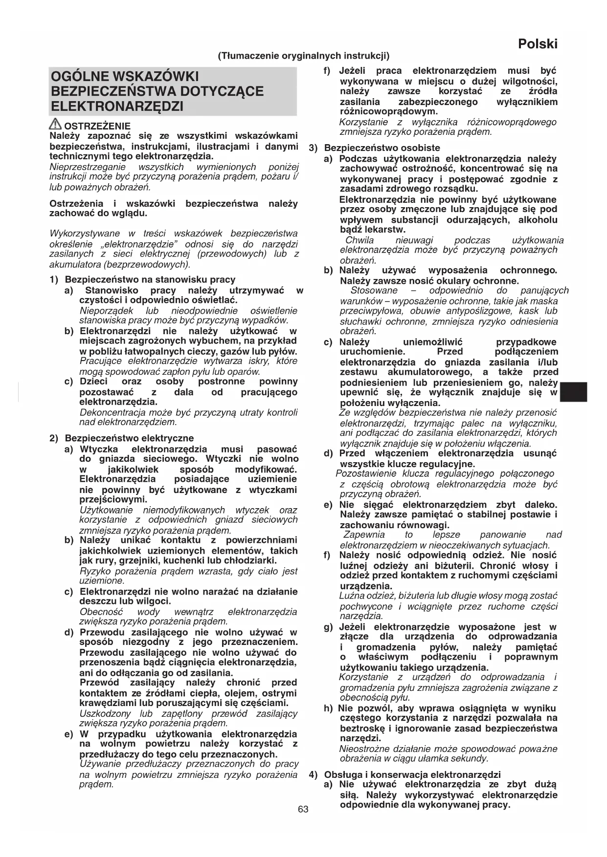 ELEKTRONARZĘDZI OSTRZEŻENIE Należy zapoznać się ze wszystkimi wskazówkami bezpieczeństwa, instrukcjami, ilustracjami i danymi technicznymi tego elektronarzędzia. Nieprzestrzeganie wszystkich wymienionych poniżej instrukcji może być przyczyną porażenia prądem, pożaru i/ lub poważnych obrażeń. Ostrzeżenia i wskazówki bezpieczeństwa należy zachować do wglądu. Wykorzystywane w treści wskazówek bezpieczeństwa określenie „elektronarzędzie” odnosi się do narzędzi zasilanych z sieci elektrycznej (przewodowych) lub z akumulatora (bezprzewodowych).