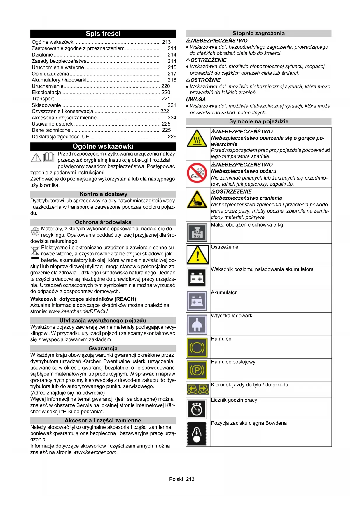 - dB(A)333 KM 85/50 W Bp (1.351-116.0) KM 85/50 W Bp *IN (1.351-118.0) KM 85/50 W Bp Pack (1.351-117.0) KM 85/50 W Bp Pack 2SB (1.351-119.0)Polski 213 Spis treści Ogólne wskazówki Przed rozpoczęciem użytkowania urządzenia należy przeczytać oryginalną instrukcję obsługi i rozdział poświęcony zasadom bezpieczeństwa. Postępować zgodnie z podanymi instrukcjami. Zachować je do późniejszego wykorzystania lub dla następnego użytkownika. Kontrola dostawy Dystrybutorowi lub sprzedawcy należy natychmiast zgłosić wady i uszkodzenia w transporcie zauważone podczas odbioru pojaz- du. Ochrona środowiska Materiały, z których wykonano opakowania, nadają się do recyklingu. Opakowania poddać utylizacji przyjaznej dla śro- dowiska naturalnego. Elektryczne i elektroniczne urządzenia zawierają cenne su- rowce wtórne, a często również takie części składowe jak baterie, akumulatory lub olej, które w razie niewłaściwej ob- sługi lub nieprawidłowej utylizacji mogą stanowić potencjalne za- grożenie dla zdrowia ludzkiego i środowiska naturalnego. Jednak te części składowe są niezbędne do prawidłowej pracy urządze- nia. Urządzeń oznaczonych tym symbolem nie można wyrzucać do odpadów z gospodarstw domowych. Wskazówki dotyczące składników (REACH) Aktualne informacje dotyczące składników można znaleźć na stronie: www.kaercher.de/REACH Utylizacja wysłużonego pojazdu Wysłużone pojazdy zawierają cenne materiały podlegające recy- klingowi. W przypadku utylizacji pojazdu zalecamy skontaktować się z wyspecjalizowanym zakładem. Gwarancja W każdym kraju obowiązują warunki gwarancji określone przez dystrybutora urządzeń Kärcher. Ewentualne usterki urządzenia usuwane są w okresie gwarancji bezpłatnie, o ile spowodowane są błędem materiałowym lub produkcyjnym. W sprawach napraw gwarancyjnych prosimy kierować się z dowodem zakupu do dys- trybutora lub do autoryzowanego punktu serwisowego. (Adres znajduje się na odwrocie) Więcej informacji na temat gwarancji (jeśli są dostępne) można znaleźć w obszarze Serwis na lokalnej stronie internetowej Kär- cher w sekcji "Pliki do pobrania". Akcesoria i części zamienne Należy stosować tylko oryginalne akcesoria i części zamienne, ponieważ gwarantują one bezpieczną i bezawaryjną pracę urzą- dzenia. Informacje dotyczące akcesoriów i części zamiennych można znaleźć na stronie www.kaercher.com. Stopnie zagrożenia NIEBEZPIECZEŃSTWO ● Wskazówka dot. bezpośredniego zagrożenia, prowadzącego do ciężkich obrażeń ciała lub do śmierci. 몇 OSTRZEŻENIE ● Wskazówka dot. możliwie niebezpiecznej sytuacji, mogącej prowadzić do ciężkich obrażeń ciała lub śmierci. 몇 OSTROŻNIE ● Wskazówka dot. możliwie niebezpiecznej sytuacji, która może prowadzić do lekkich zranień. UWAGA ● Wskazówka dot. możliwie niebezpiecznej sytuacji, która może prowadzić do szkód materialnych. Symbole na pojeździe Ogólne wskazówki p. 213