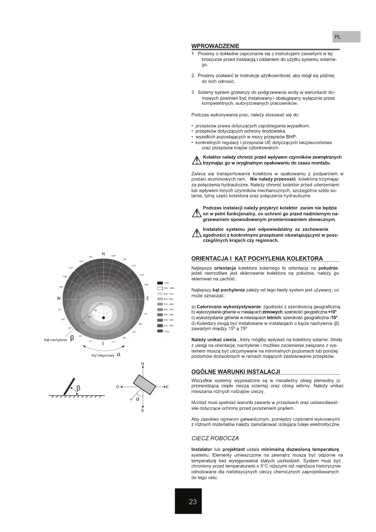 CIECZ ROBOCZA Instalator lub projektant ustala minimalną dozwoloną temperaturę systemu. Elementy umieszczone na zewnątrz muszą być odporne na temperaturę bez występowania stałych uszkodzeń. System musi być chroniony przed temperaturami o 5°C niższymi niż najniższe historycznie odnotowane dla nietoksycznych cieczy chemicznych zaprojektowanych do tego celu. Kąt nachyleniaKąt biegunowy24