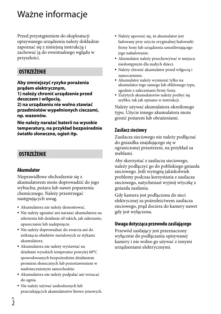 Należy upewnić się, że akumulator jest ładowany przy użyciu oryginalnej ładowarki firmy Sony lub urządzenia umożliwiającego jego naładowanie. Akumulator należy przechowywać w miejscu niedostępnym dla małych dzieci. Należy chronić akumulator przed wilgocią i zamoczeniem. Akumulator należy wymienić tylko na akumulator tego samego lub zbliżonego typu, zgodnie z zaleceniami firmy Sony. Zużytych akumulatorów należy pozbyć się szybko, tak jak opisano w instrukcji. Należy używać akumulatora określonego typu. Użycie innego akumulatora może grozić pożarem lub obrażeniami. Zasilacz sieciowy Zasilacza sieciowego nie należy podłączać do gniazdka znajdującego się w ograniczonej przestrzeni, na przykład za meblami. Aby skorzystać z zasilacza sieciowego, należy podłączyć go do pobliskiego gniazda sieciowego. Jeśli wystąpią jakiekolwiek problemy podczas korzystania z zasilacza sieciowego, natychmiast wyjmij wtyczkę z gniazda zasilania. Gdy kamera jest podłączona do sieci elektrycznej za pośrednictwem zasilacza sieciowego, prąd dociera do kamery nawet gdy jest wyłączona. Uwaga dotycząca przewodu zasilającego Przewód zasilający jest przeznaczony wyłącznie do podłączania opisywanej kamery i nie wolno go używać z innymi urządzeniami elektrycznymi.