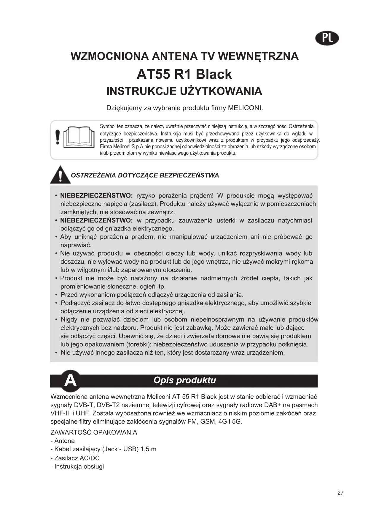 Dziękujemy za wybranie produktu rmy MELICONI. Wzmocniona antena wewnętrzna Meliconi AT 55 R1 Black jest w stanie odbierać i wzmacniać sygnały DVB-T, DVB-T2 naziemnej telewizji cyfrowej oraz sygnały radiowe DAB+ na pasmach VHF-III i UHF. Została wyposażona również we wzmacniacz o niskim poziomie zakłóceń oraz specjalne ltry eliminujące zakłócenia sygnałów FM, GSM, 4G i 5G.ZAWARTOŚĆ OPAKOWANIA- Antena- Kabel zasilający (Jack - USB) 1,5 m- Zasilacz AC/DC- Instrukcja obsługi