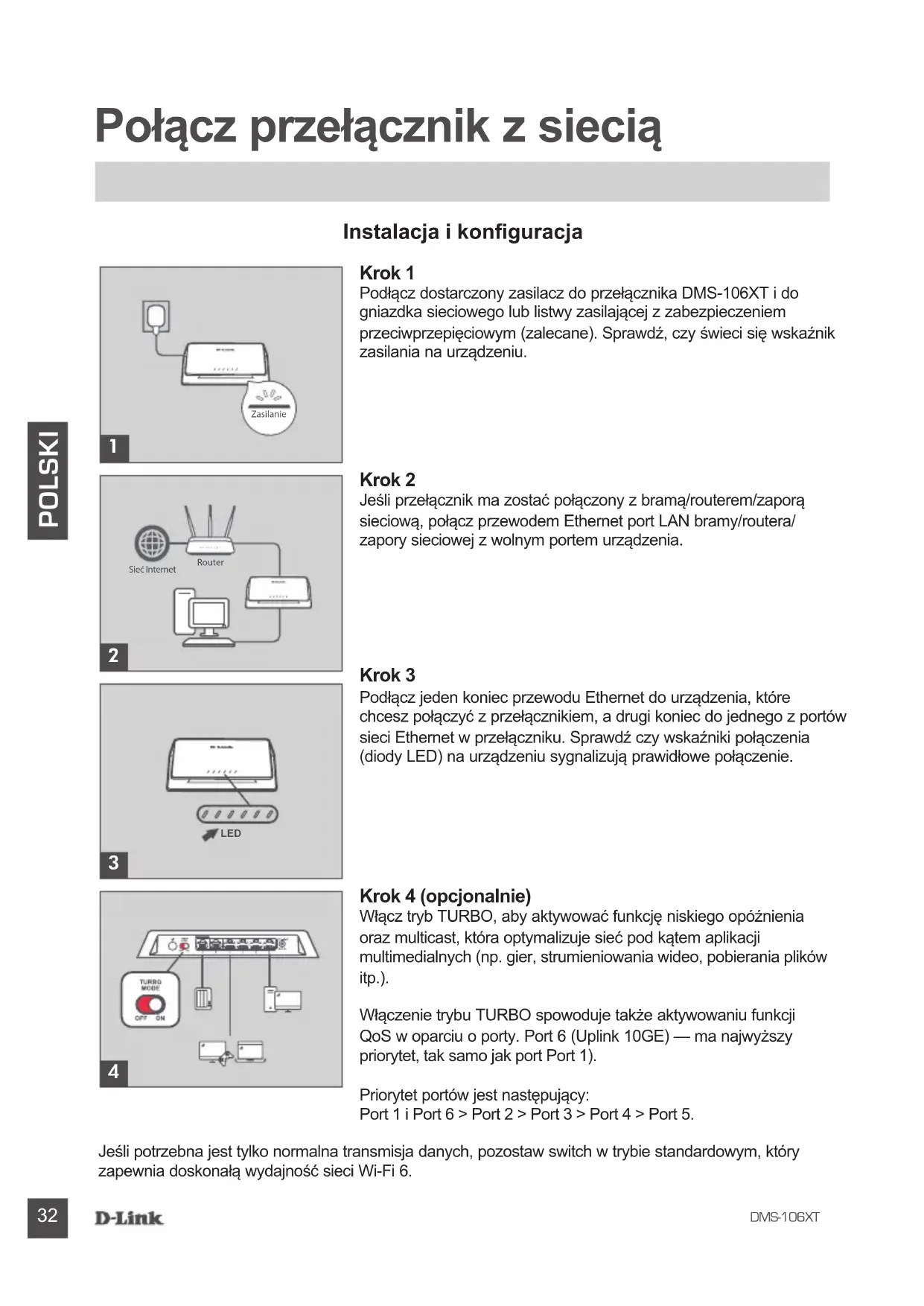 POLSKI Połącz przełącznik z siecią Jeśli potrzebna jest tylko normalna transmisja danych, pozostaw switch w trybie standardowym, który zapewnia doskonałą wydajność sieci Wi-Fi 6. Krok 1 Podłącz dostarczony zasilacz do przełącznika DMS-106XT i dogniazdka sieciowego lub listwy zasilającej z zabezpieczeniemprzeciwprzepięciowym (zalecane). Sprawdź, czy świeci się wskaźnik zasilania na urządzeniu. Krok 2 Jeśli przełącznik ma zostać połączony z bramą/routerem/zaporąsieciową, połącz przewodem Ethernet port LAN bramy/routera/zapory sieciowej z wolnym portem urządzenia. Krok 3 Podłącz jeden koniec przewodu Ethernet do urządzenia, którechcesz połączyć z przełącznikiem, a drugi koniec do jednego z portów sieci Ethernet w przełączniku. Sprawdź czy wskaźniki połączenia (diody LED) na urządzeniu sygnalizują prawidłowe połączenie. Krok 4 (opcjonalnie) Włącz tryb TURBO, aby aktywować funkcję niskiego opóźnieniaoraz multicast, która optymalizuje sieć pod kątem aplikacjimultimedialnych (np. gier, strumieniowania wideo, pobierania plikówitp.).Włączenie trybu TURBO spowoduje także aktywowaniu funkcjiQoS w oparciu o porty. Port 6 (Uplink 10GE) — ma najwyższy priorytet, tak samo jak port Port 1). Priorytet portów jest następujący:Port 1 i Port 6 > Port 2 > Port 3 > Port 4 > Port 5. Instalacja i konguracja