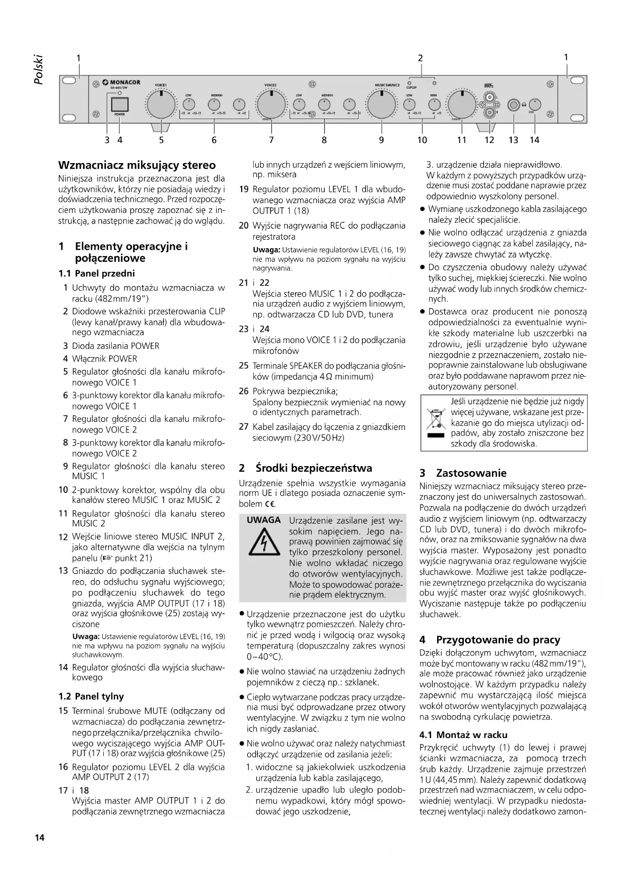 DanskDansk SidaSvenskaSvenska SidanSuomiSuomi SivultaPolskiPolski Strona Wzmacniacz miksujący stereo Niniejsza instrukcja przeznaczona jest dla użytkowników, którzy nie posiadają wiedzy i doświadczenia technicznego. Przed rozpoczę- ciem użytkowania proszę zapoznać się z in- strukcją, a następnie zachować ją do wglądu. 1 Elementy operacyjne i połączeniowe