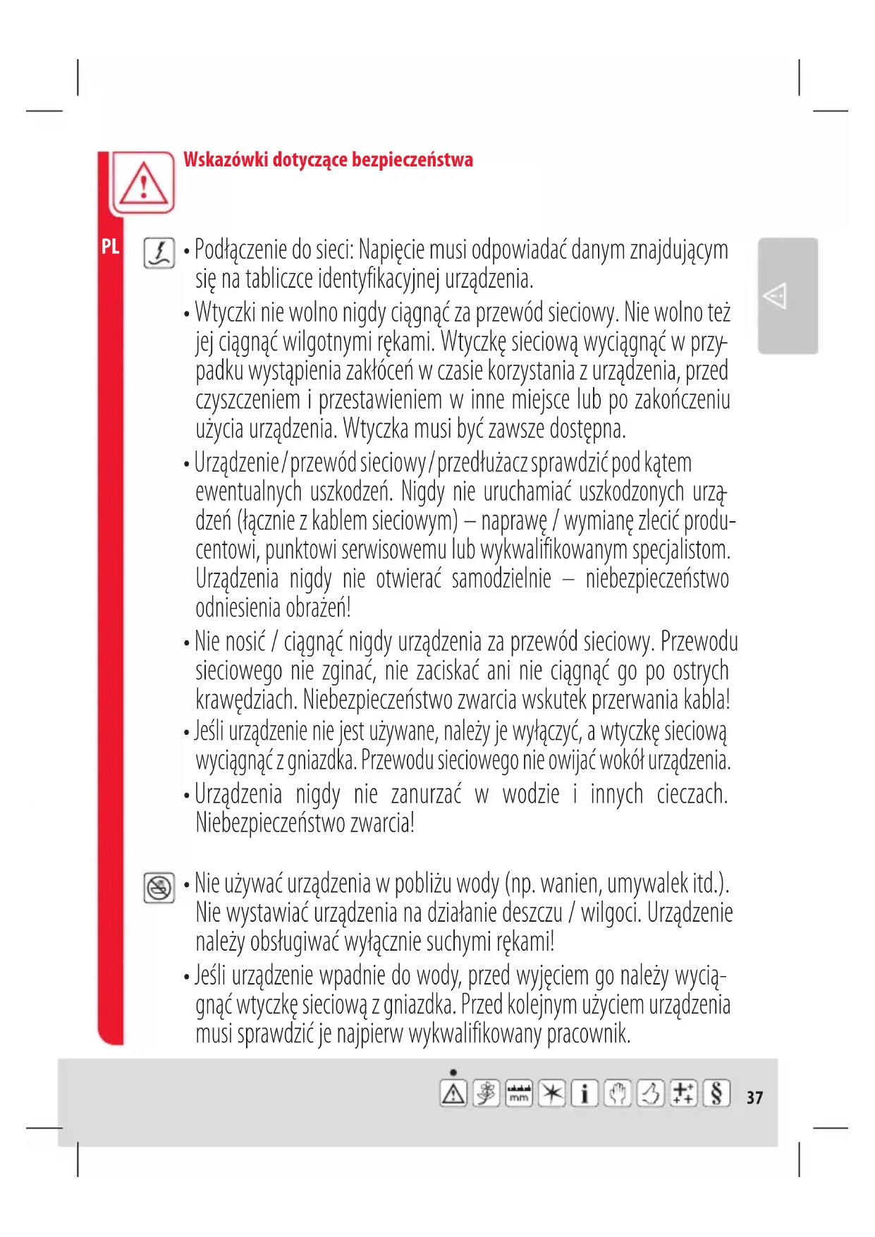 - Jeśli urządzenie wpadnie do wody, przed wyjęciem go należy wycią- gnąć wtyczkę sieciową z gniazdka. Przed kolejnym użyciem urządzenia musi sprawdzić je najpierw wykwalifikowany pracownik.38