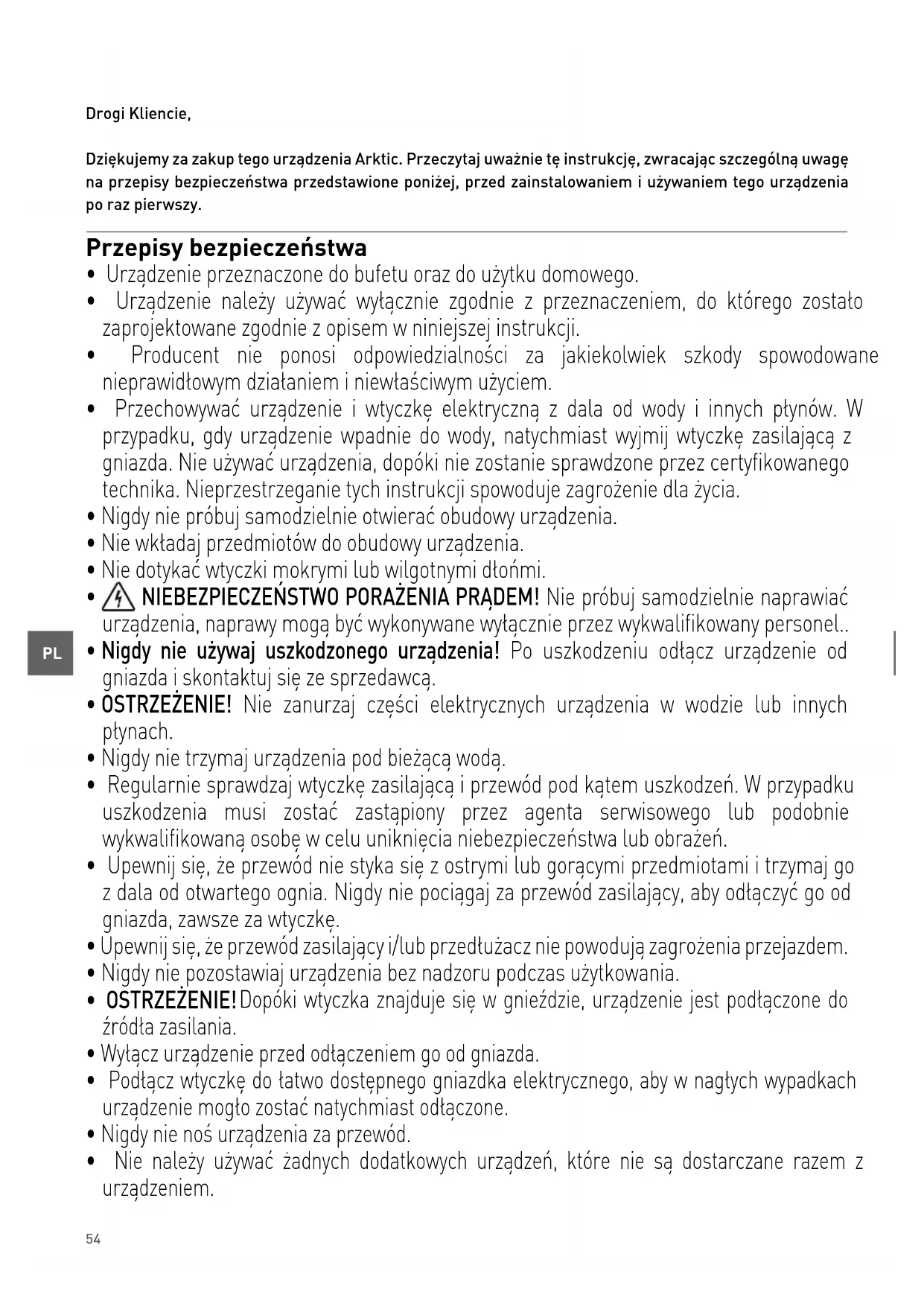 Drogi Kliencie, Dziękujemy za zakup tego urządzenia Arktic. Przeczytaj uważnie tę instrukcję, zwracając szczególną uwagę na przepisy bezpieczeństwa przedstawione poniżej, przed zainstalowaniem i używaniem tego urządzenia po raz pierwszy. Przepisy bezpieczeństwa