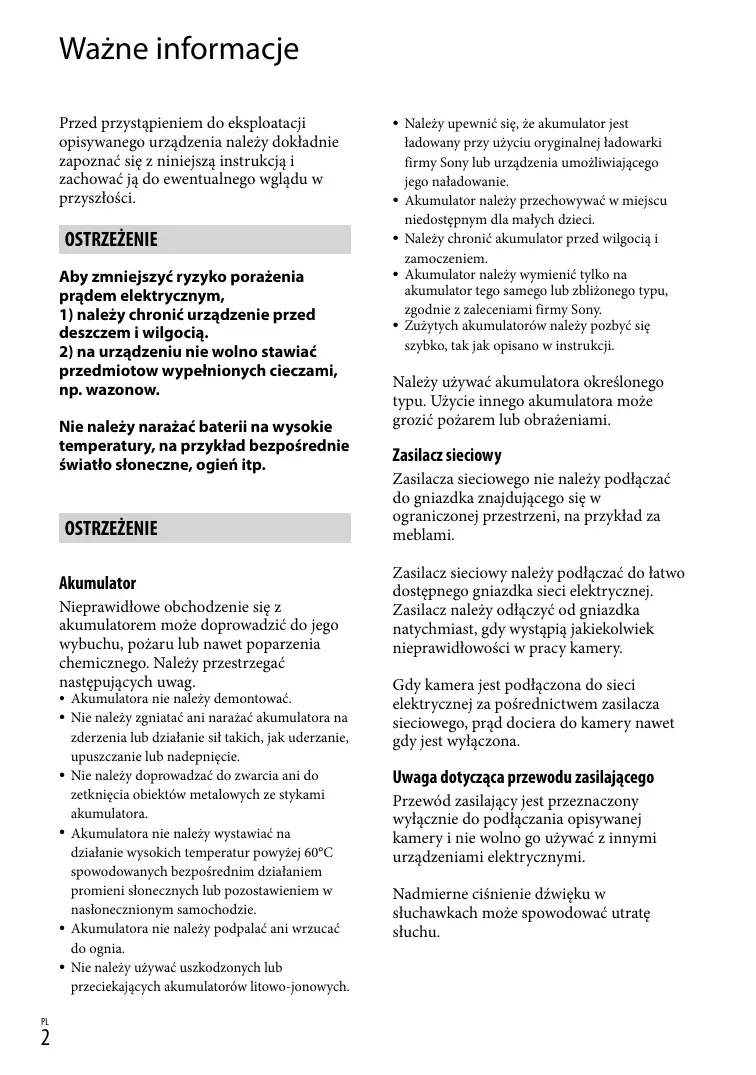 Należy upewnić się, że akumulator jest ładowany przy użyciu oryginalnej ładowarki firmy Sony lub urządzenia umożliwiającego jego naładowanie. Akumulator należy przechowywać w miejscu niedostępnym dla małych dzieci. Należy chronić akumulator przed wilgocią i zamoczeniem. Akumulator należy wymienić tylko na akumulator tego samego lub zbliżonego typu, zgodnie z zaleceniami firmy Sony. Zużytych akumulatorów należy pozbyć się szybko, tak jak opisano w instrukcji. Należy używać akumulatora określonego typu. Użycie innego akumulatora może grozić pożarem lub obrażeniami. Zasilacz sieciowy Zasilacza sieciowego nie należy podłączać do gniazdka znajdującego się w ograniczonej przestrzeni, na przykład za meblami. Zasilacz sieciowy należy podłączać do łatwo dostępnego gniazdka sieci elektrycznej. Zasilacz należy odłączyć od gniazdka natychmiast, gdy wystąpią jakiekolwiek nieprawidłowości w pracy kamery. Gdy kamera jest podłączona do sieci elektrycznej za pośrednictwem zasilacza sieciowego, prąd dociera do kamery nawet gdy jest wyłączona. Uwaga dotycząca przewodu zasilającego Przewód zasilający jest przeznaczony wyłącznie do podłączania opisywanej kamery i nie wolno go używać z innymi urządzeniami elektrycznymi. Nadmierne ciśnienie dźwięku w słuchawkach może spowodować utratę słuchu.