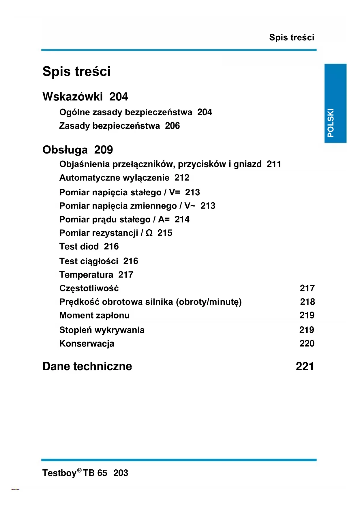 TB 65 203 POLSKI POLSKI POLSKI POLSKI Spis treści Wskazówki 204 Ogólne zasady bezpieczeństwa 204 Zasady bezpieczeństwa 206 Obsługa 209 Objaśnienia przełączników, przycisków i gniazd 211 Automatyczne wyłączenie 212 Pomiar napięcia stałego / V= 213 Pomiar napięcia zmiennego / V~ 213 Pomiar prądu stałego / A= 214 Pomiar rezystancji / Ω 215 Test diod 216 Test ciągłości 216 Temperatura 217 Częstotliwość 217 Prędkość obrotowa silnika (obroty/minutę) 218 Moment zapłonu 219 Stopień wykrywania 219 Konserwacja 220 Dane techniczne 221Wskazówki