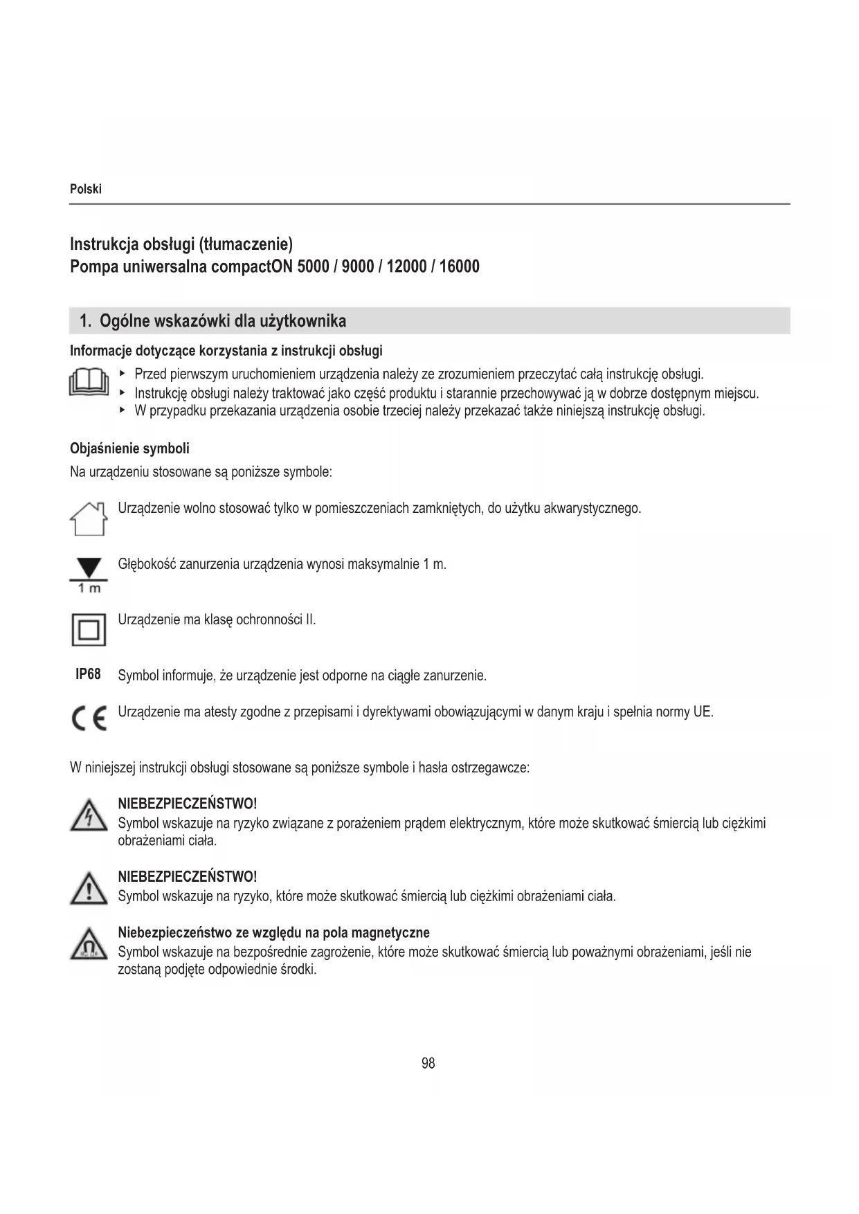 Informacje dotyczące korzystania z instrukcji obsługi ▶ Przed pierwszym uruchomieniem urządzenia należy ze zrozumieniem przeczytać całą instrukcję obsługi. ▶ Instrukcję obsługi należy traktować jako część produktu i starannie przechowywać ją w dobrze dostępnym miejscu. ▶ W przypadku przekazania urządzenia osobie trzeciej należy przekazać także niniejszą instrukcję obsługi. Objaśnienie symboli Na urządzeniu stosowane są poniższe symbole: Urządzenie wolno stosować tylko w pomieszczeniach zamkniętych, do użytku akwarystycznego. Głębokość zanurzenia urządzenia wynosi maksymalnie 1 m. Urządzenie ma klasę ochronności II. Symbol informuje, że urządzenie jest odporne na ciągłe zanurzenie. Urządzenie ma atesty zgodne z przepisami i dyrektywami obowiązującymi w danym kraju i spełnia normy UE. W niniejszej instrukcji obsługi stosowane są poniższe symbole i hasła ostrzegawcze: NIEBEZPIECZEŃSTWO! Symbol wskazuje na ryzyko związane z porażeniem prądem elektrycznym, które może skutkować śmiercią lub ciężkimi obrażeniami ciała. NIEBEZPIECZEŃSTWO! Symbol wskazuje na ryzyko, które może skutkować śmiercią lub ciężkimi obrażeniami ciała. Niebezpieczeństwo ze względu na pola magnetyczne Symbol wskazuje na bezpośrednie zagrożenie, które może skutkować śmiercią lub poważnymi obrażeniami, jeśli nie zostaną podjęte odpowiednie środki. IP6899 Polski OSTRZEŻENIE! Symbol wskazuje na ryzyko, które może skutkować lekkimi lub średnimi obrażeniami ciała lub stanowić zagrożenie dla zdrowia. ZACHOWAĆ OSTROŻNOŚĆ! Symbol wskazuje na ryzyko szkód materialnych. Wskazówka zawierająca przydatne informacje i rady. Rodzaje oznaczeń Odnośnik do rysunku, tutaj odnośnik do rysunku A. Wezwanie do podjęcia działania.