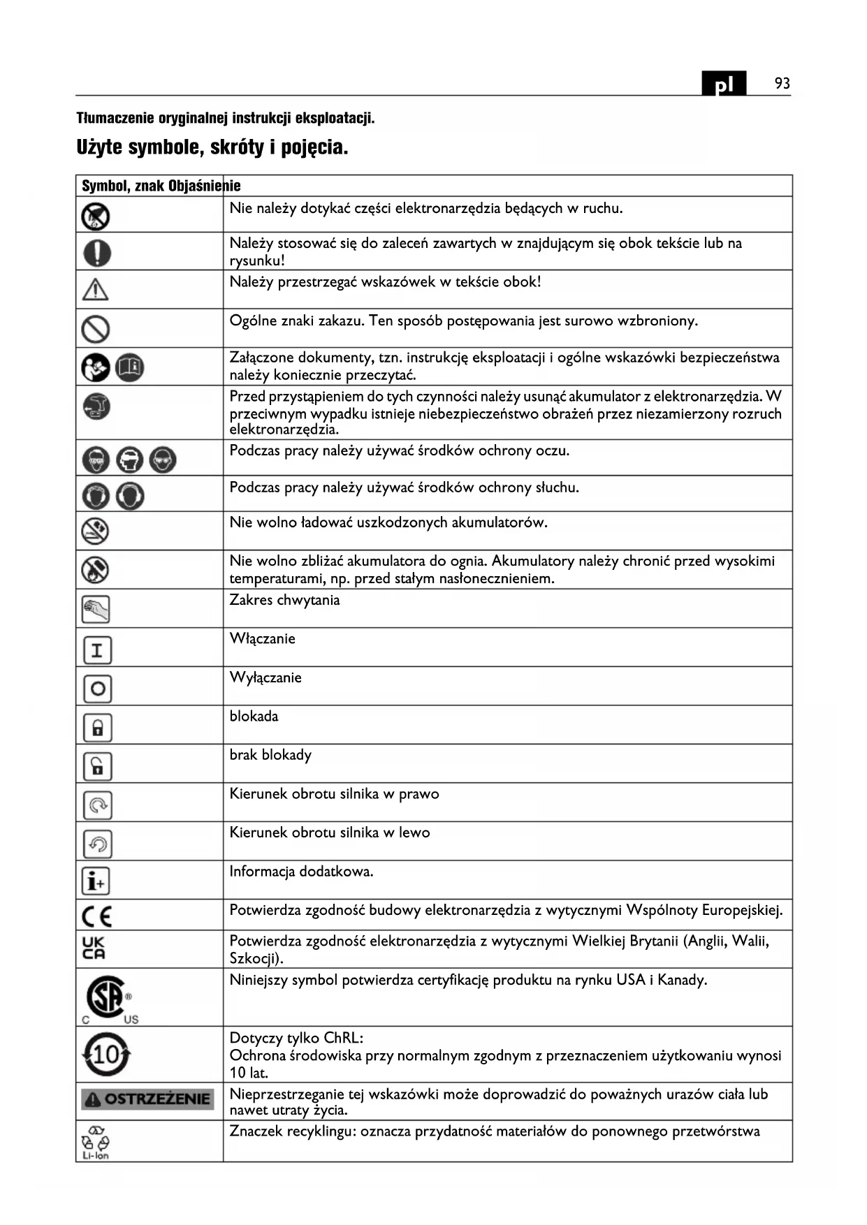 Tłumaczenie oryginalnej instrukcji eksploatacji. Użyte symbole, skróty i pojęcia. Symbol, znak Objaśnienie Nie należy dotykać części elektronarzędzia będących w ruchu. Należy stosować się do zaleceń zawartych w znajdującym się obok tekście lub na rysunku! Należy przestrzegać wskazówek w tekście obok! Ogólne znaki zakazu. Ten sposób postępowania jest surowo wzbroniony. Załączone dokumenty, tzn. instrukcję eksploatacji i ogólne wskazówki bezpieczeństwa należy koniecznie przeczytać. Przed przystąpieniem do tych czynności należy usunąć akumulator z elektronarzędzia. W przeciwnym wypadku istnieje niebezpieczeństwo obrażeń przez niezamierzony rozruch elektronarzędzia. Podczas pracy należy używać środków ochrony oczu. Podczas pracy należy używać środków ochrony słuchu. Nie wolno ładować uszkodzonych akumulatorów. Nie wolno zbliżać akumulatora do ognia. Akumulatory należy chronić przed wysokimi temperaturami, np. przed stałym nasłonecznieniem. Zakres chwytania Włączanie Wyłączanie blokada brak blokady Kierunek obrotu silnika w prawo Kierunek obrotu silnika w lewo Informacja dodatkowa. Potwierdza zgodność budowy elektronarzędzia z wytycznymi Wspólnoty Europejskiej. Potwierdza zgodność elektronarzędzia z wytycznymi Wielkiej Brytanii (Anglii, Walii, Szkocji). Niniejszy symbol potwierdza certyfikację produktu na rynku USA i Kanady. Dotyczy tylko ChRL: Ochrona środowiska przy normalnym zgodnym z przeznaczeniem użytkowaniu wynosi 10 lat. Nieprzestrzeganie tej wskazówki może doprowadzić do poważnych urazów ciała lub nawet utraty życia. Znaczek recyklingu: oznacza przydatność materiałów do ponownego przetwórstwa94