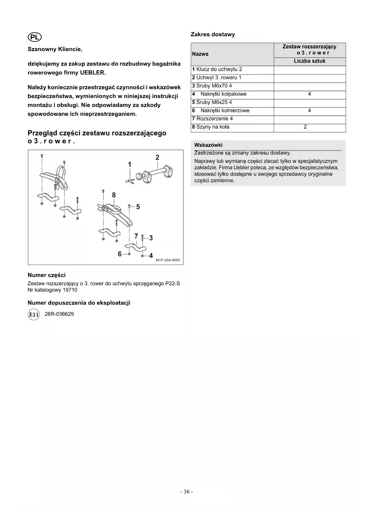 Szanowny Kliencie, dziękujemy za zakup zestawu do rozbudowy bagażnika rowerowego firmy UEBLER. Należy koniecznie przestrzegać czynności i wskazówek bezpieczeństwa, wymienionych w niniejszej instrukcji montażu i obsługi. Nie odpowiadamy za szkody spowodowane ich nieprzestrzeganiem. Przegląd części zestawu rozszerzającego o3.rower. Numer części Zestaw rozszerzający o 3. rower do uchwytu sprzęganego P22-S Nr katalogowy 19710 Numer dopuszczenia do eksploatacji 26R-036629 Zakres dostawy