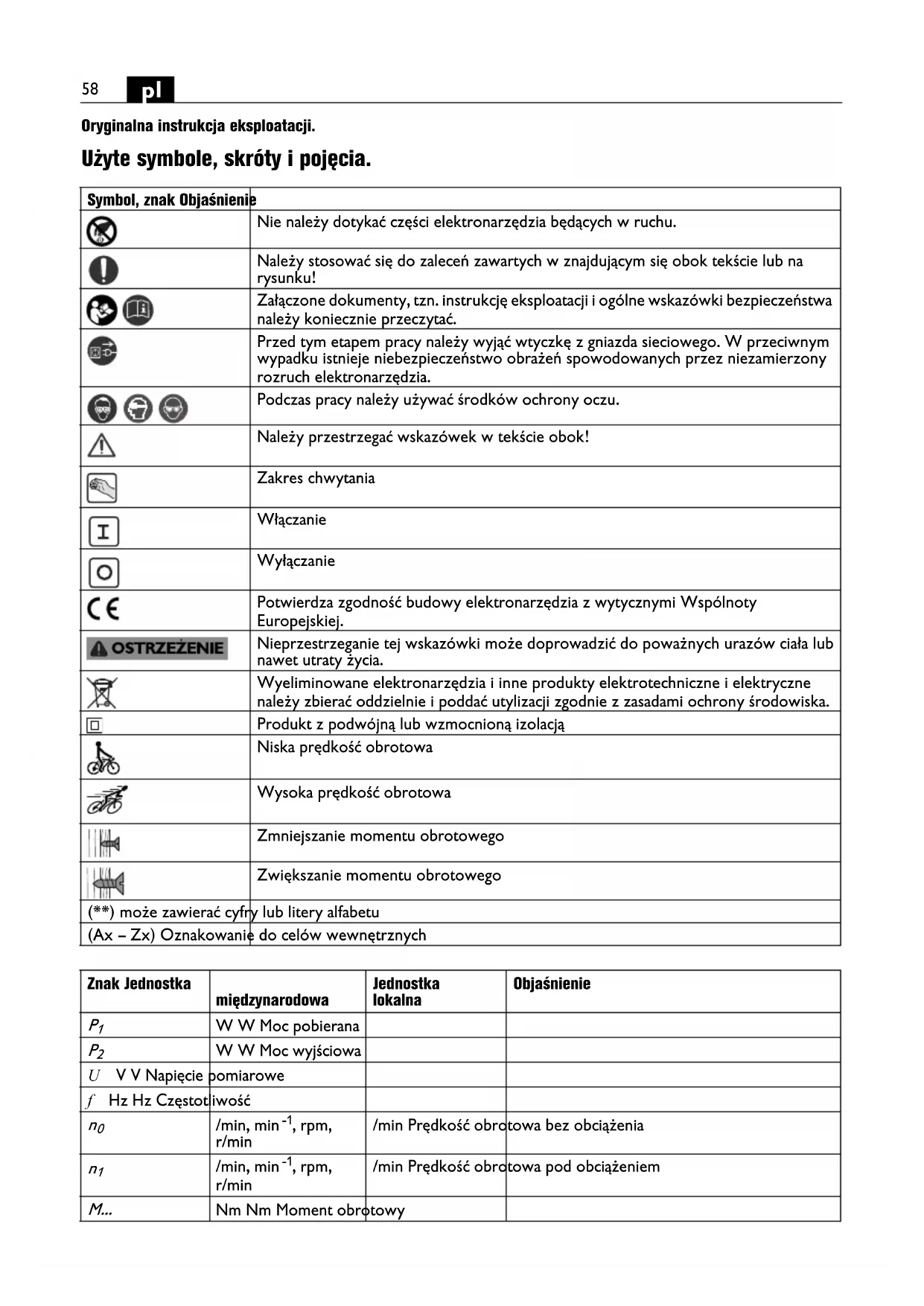 Oryginalna instrukcja eksploatacji. Użyte symbole, skróty i pojęcia. Symbol, znak Objaśnienie Nie należy dotykać części elektronarzędzia będących w ruchu. Należy stosować się do zaleceń zawartych w znajdującym się obok tekście lub na rysunku! Załączone dokumenty, tzn. instrukcję eksploatacji i ogólne wskazówki bezpieczeństwa należy koniecznie przeczytać. Przed tym etapem pracy należy wyjąć wtyczkę z gniazda sieciowego. W przeciwnym wypadku istnieje niebezpieczeństwo obrażeń spowodowanych przez niezamierzony rozruch elektronarzędzia. Podczas pracy należy używać środków ochrony oczu. Należy przestrzegać wskazówek w tekście obok! Zakres chwytania Włączanie Wyłączanie Potwierdza zgodność budowy elektronarzędzia z wytycznymi Wspólnoty Europejskiej. Nieprzestrzeganie tej wskazówki może doprowadzić do poważnych urazów ciała lub nawet utraty życia. Wyeliminowane elektronarzędzia i inne produkty elektrotechniczne i elektryczne należy zbierać oddzielnie i poddać utylizacji zgodnie z zasadami ochrony środowiska. Produkt z podwójną lub wzmocnioną izolacją Niska prędkość obrotowa Wysoka prędkość obrotowa Zmniejszanie momentu obrotowego Zwiększanie momentu obrotowego (**) może zawierać cyfry lub litery alfabetu (Ax – Zx) Oznakowanie do celów wewnętrznych Znak Jednostka międzynarodowa Jednostka lokalna Objaśnienie