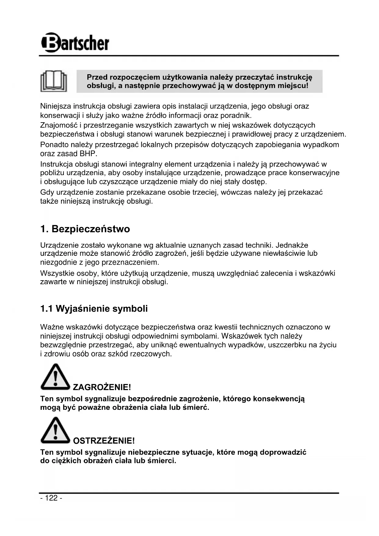 Niniejsza instrukcja obsługi zawiera opis instalacji urządzenia, jego obsługi oraz konserwacji i służy jako ważne źródło informacji oraz poradnik. Znajomość i przestrzeganie wszystkich zawartych w niej wskazówek dotyczących bezpieczeństwa i obsługi stanowi warunek bezpiecznej i prawidłowej pracy z urządzeniem. Ponadto należy przestrzegać lokalnych przepisów dotyczących zapobiegania wypadkom oraz zasad BHP. Instrukcja obsługi stanowi integralny element urządzenia i należy ją przechowywać w pobliżu urządzenia, aby osoby instalujące urządzenie, prowadzące prace konserwacyjne i obsługujące lub czyszczące urządzenie miały do niej stały dostęp. Gdy urządzenie zostanie przekazane osobie trzeciej, wówczas należy jej przekazać także niniejszą instrukcję obsługi.