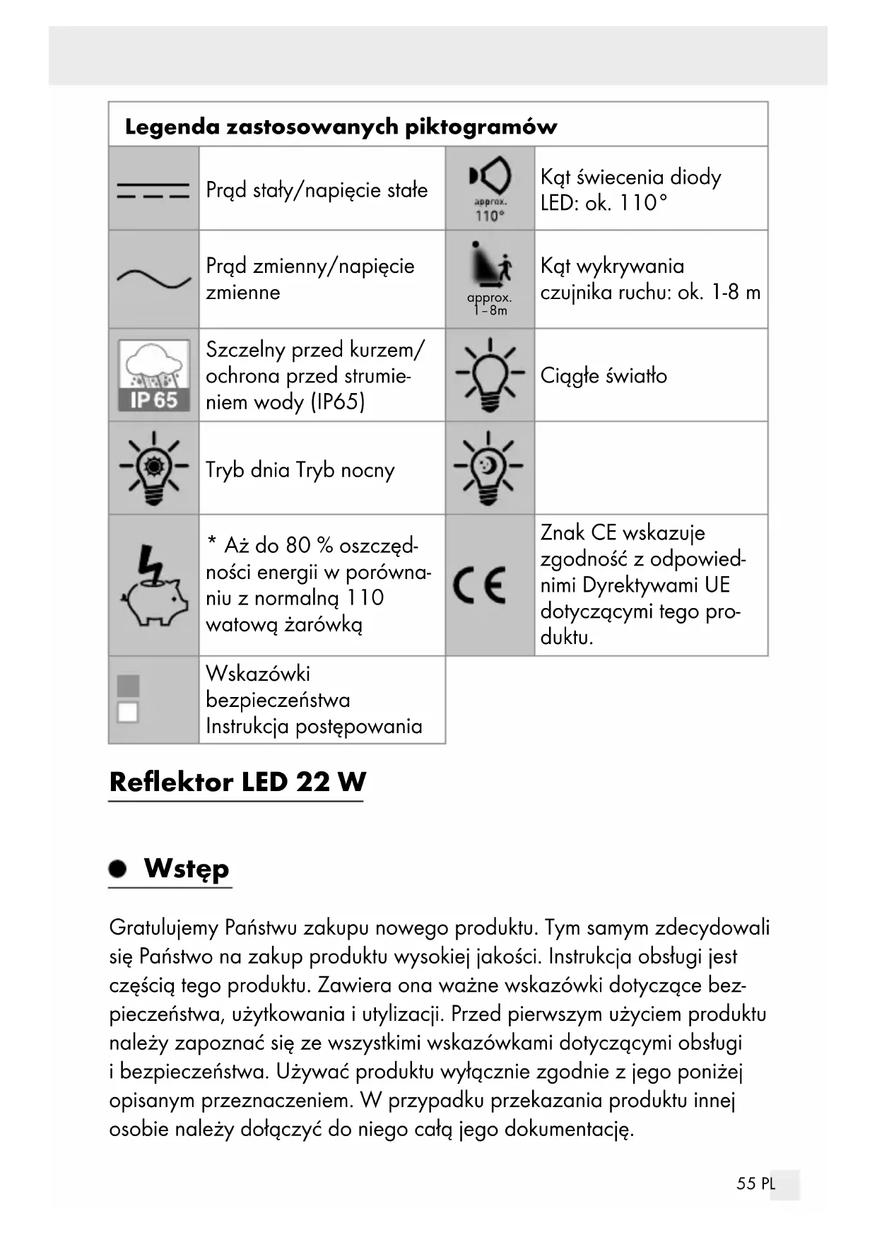 - Aż do 80 % oszczęd- ności energii w porówna- niu z normalną 110 watową żarówką Znak CE wskazuje zgodność z odpowied- nimi Dyrektywami UE dotyczącymi tego pro- duktu. Wskazówki bezpieczeństwa Instrukcja postępowania Reflektor LED 22 W Wstęp Gratulujemy Państwu zakupu nowego produktu. Tym samym zdecydowali się Państwo na zakup produktu wysokiej jakości. Instrukcja obsługi jest częścią tego produktu. Zawiera ona ważne wskazówki dotyczące bez- pieczeństwa, użytkowania iutylizacji. Przed pierwszym użyciem produktu należy zapoznać się ze wszystkimi wskazówkami dotyczącymi obsługi ibezpieczeństwa. Używać produktu wyłącznie zgodnie zjego poniżej opisanym przeznaczeniem. Wprzypadku przekazania produktu innej osobie należy dołączyć do niego całą jego dokumentację.56 PL Zastosowanie zgodne z przeznaczeniem Ten produkt przeznaczony jest do oświetlania obszaru tylko na zewnątrz. Produkt jest przeznaczony wyłącznie do prywatnego zastosowania, a nie do użytku komercyjnego lub innych rodzajów zastosowań. Opis części