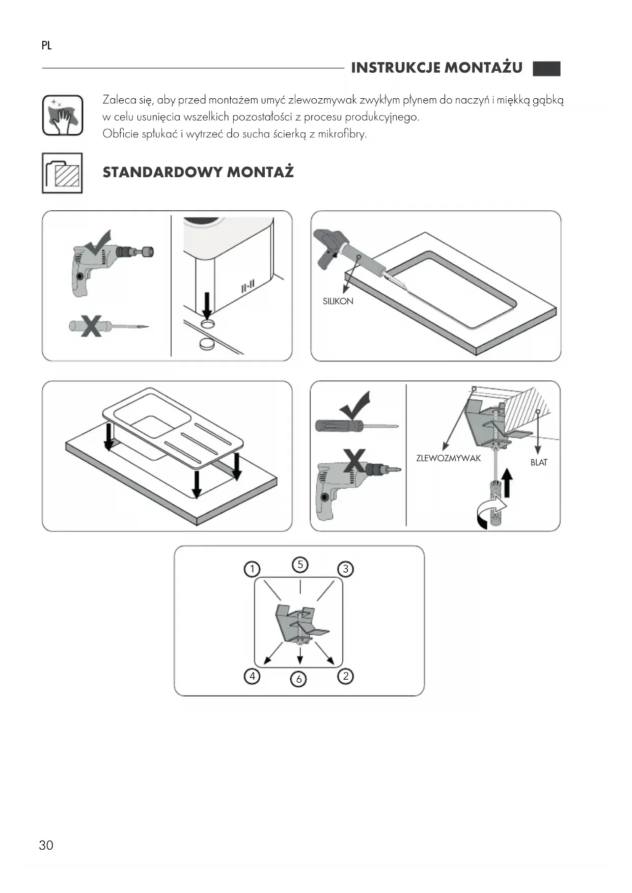 Zaleca się, aby przed montażem umyć zlewozmywak zwykłym płynem do naczyń i miękką gąbką w celu usunięcia wszelkich pozostałości z procesu produkcyjnego. Obficie spłukać i wytrzeć do sucha ścierką z mikrofibry. STANDARDOWY MONTAŻ BLAT ZLEWOZMYWAKSILIKON31