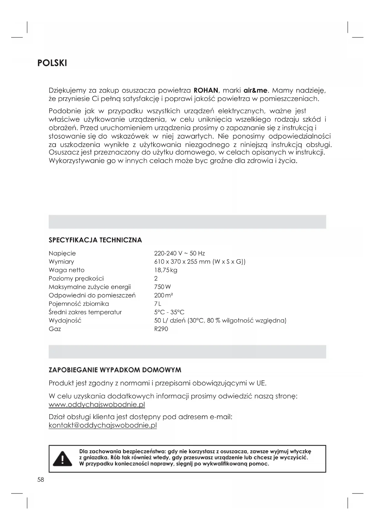 Dla zachowania bezpieczeństwa: gdy nie korzystasz z osuszacza, zawsze wyjmuj wtyczkę z gniazdka. Rób tak również wtedy, gdy przesuwasz urządzenie lub chcesz je wyczyścić. W przypadku konieczności naprawy, sięgnij po wykwalikowaną pomoc. Produkt jest zgodny z normami i przepisami obowiązującymi w UE. W celu uzyskania dodatkowych informacji prosimy odwiedzić naszą stronę: www.oddychajswobodnie.pl Dział obsługi klienta jest dostępny pod adresem e-mail: kontakt@oddychajswobodnie.pl Napięcie Wymiary Waga netto Poziomy prędkości Maksymalne zużycie energii Odpowiedni do pomieszczeń Pojemność zbiornika Średni zakres temperatur Wydajność Gaz SPECYFIKACJA TECHNICZNA 220-240 V ~ 50 Hz 610 x 370 x 255 mm (W x S x G)) 18,75 kg