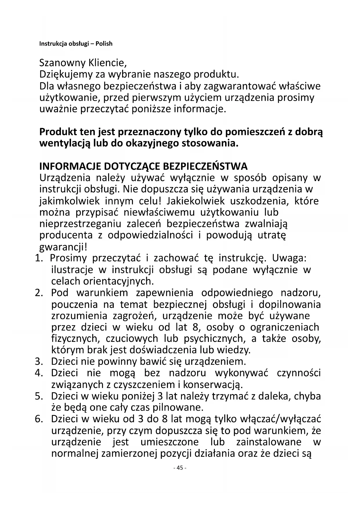 urządzenie, przy czym dopuszcza się to pod warunkiem, że urządzenie jest umieszczone lub zainstalowane w normalnej zamierzonej pozycji działania oraz że dzieci są- 46 - pilnowane lub zostały pouczone na temat bezpiecznego używania urządzenia i rozumieją występujące zagrożenia. Dzieci w wieku od 3 do 8 lat nie powinny wkładać wtyczki do kontaktu, nastawiać urządzenia, czyścić go, ani wykonywać przy nim czynności konserwacyjnych.