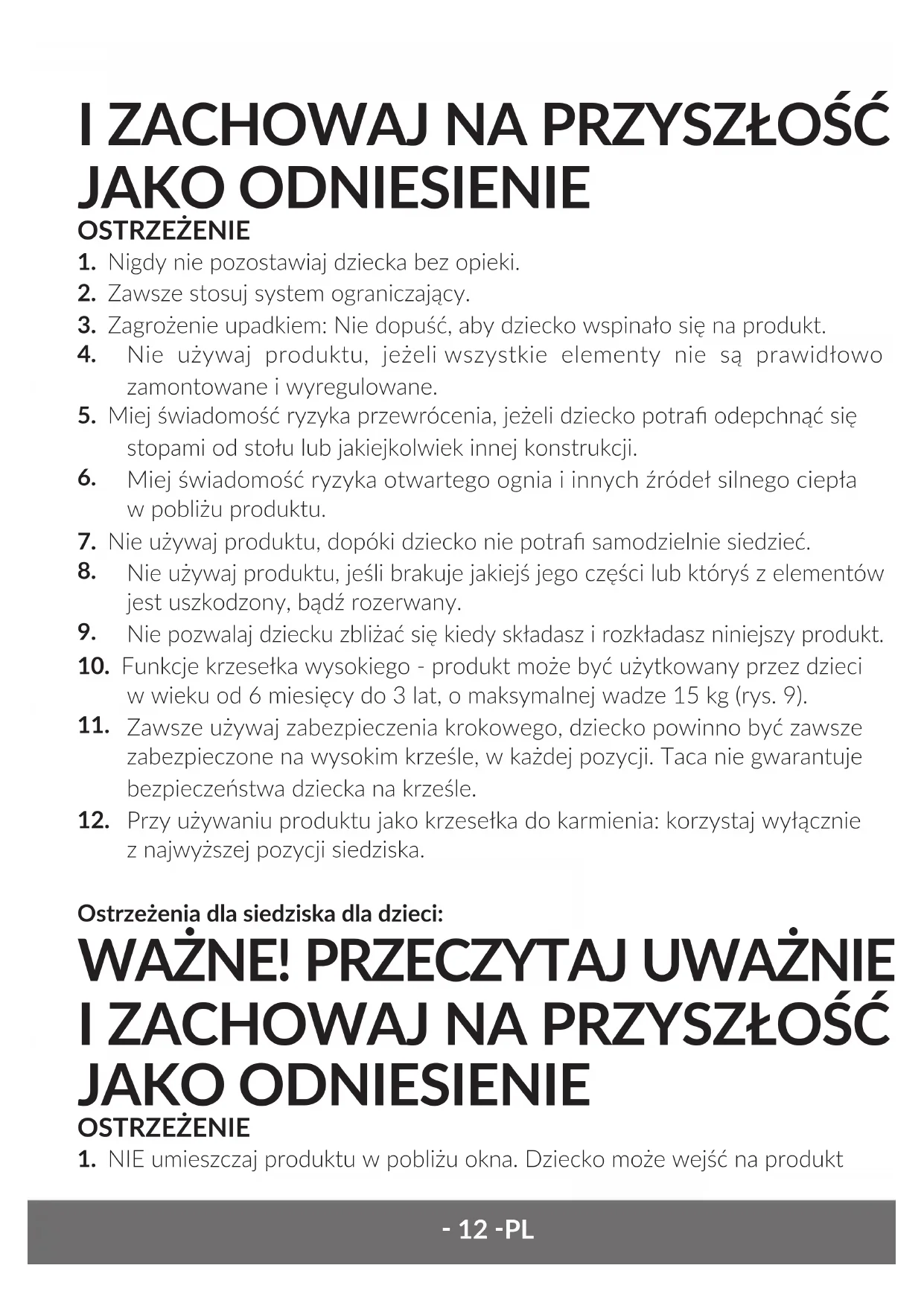 Przy używaniu produktu jako krzesełka do karmienia: korzystaj wyłącznie z najwyższej pozycji siedziska. Ostrzeżenia dla siedziska dla dzieci: