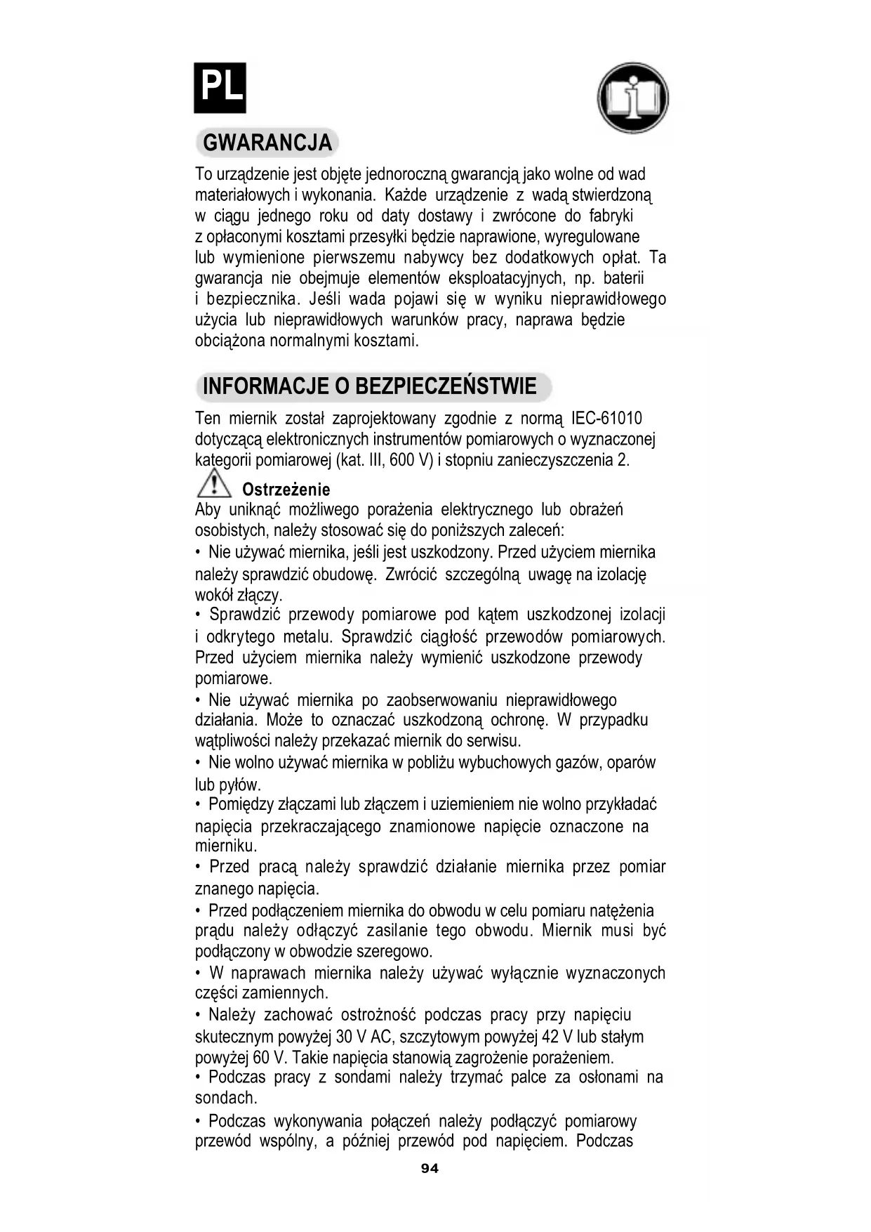 Ten miernik został zaprojektowany zgodnie z normą IEC-61010 dotyczącą elektronicznych instrumentów pomiarowych o wyznaczonej kategorii pomiarowej (kat. III, 600 V) i stopniu zanieczyszczenia 2. Ostrzeżenie Aby uniknąć możliwego porażenia elektrycznego lub obrażeń osobistych, należy stosować się do poniższych zaleceń: