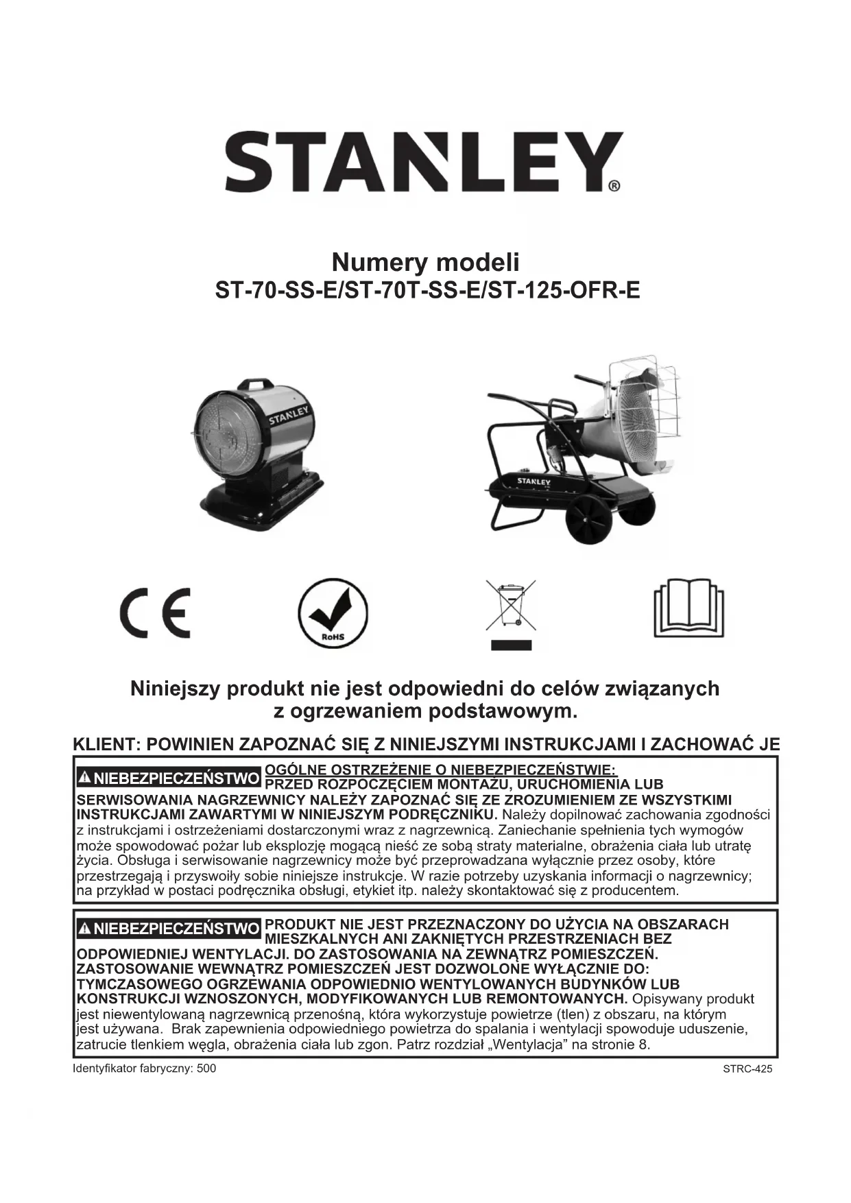 REP Obelis S.A. Dirección registrada: Bd. Général Wahis, 53 1030 Brussels, Belgium © 2021 Stanley Black & Decker, Inc.KLIENT: POWINIEN ZAPOZNAĆ SIĘ Z NINIEJSZYMI INSTRUKCJAMI I ZACHOWAĆ JE OGÓLNE OSTRZEŻENIE O NIEBEZPIECZEŃSTWIE:PRZED ROZPOCZĘCIEM MONTAŻU, URUCHOMIENIA LUB SERWISOWANIA NAGRZEWNICY NALEŻY ZAPOZNAĆ SIĘ ZE ZROZUMIENIEM ZE WSZYSTKIMI INSTRUKCJAMI ZAWARTYMI W NINIEJSZYM PODRĘCZNIKU. Należy dopilnować zachowania zgodności z instrukcjami i ostrzeżeniami dostarczonymi wraz z nagrzewnicą. Zaniechanie spełnienia tych wymogów może spowodować pożar lub eksplozję mogącą nieść ze sobą straty materialne, obrażenia ciała lub utratę życia. Obsługa i serwisowanie nagrzewnicy może być przeprowadzana wyłącznie przez osoby, które przestrzegają i przyswoiły sobie niniejsze instrukcje. W razie potrzeby uzyskania informacji o nagrzewnicy; na przykład w postaci podręcznika obsługi, etykiet itp. należy skontaktować się z producentem. NIEBEZPIECZEŃSTWO PRODUKT NIE JEST PRZEZNACZONY DO UŻYCIA NA OBSZARACHMIESZKALNYCH ANI ZAKNIĘTYCH PRZESTRZENIACH BEZ ODPOWIEDNIEJ WENTYLACJI. DO ZASTOSOWANIA NA ZEWNĄTRZ POMIESZCZEŃ. ZASTOSOWANIE WEWNĄTRZ POMIESZCZEŃ JEST DOZWOLONE WYŁĄCZNIE DO: TYMCZASOWEGO OGRZEWANIA ODPOWIEDNIO WENTYLOWANYCH BUDYNKÓW LUB KONSTRUKCJI WZNOSZONYCH, MODYFIKOWANYCH LUB REMONTOWANYCH. Opisywany produkt jest niewentylowaną nagrzewnicą przenośną, która wykorzystuje powietrze (tlen) z obszaru, na którym jest używana. Brak zapewnienia odpowiedniego powietrza do spalania i wentylacji spowoduje uduszenie, zatrucie tlenkiem węgla, obrażenia ciała lub zgon. Patrz rozdział „Wentylacja” na stronie 8.Identykator fabryczny: 500 Numery modeli