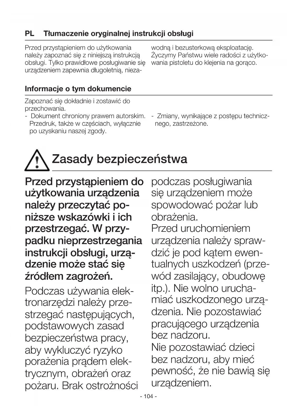 ZÁRUKA ROK VÝROBCU ZÁRUKA ROKY VÝROBCU ZÁRUKA ROKOV VÝROBCU Technické údaje GlueMatic 1011 GlueMatic 3011Fáza ohrevu: 7 – 8min. cca 7min.Teplota tavenia: 200°C 200°CVýkon: 13g/min. 16g/min.Rozmery (D׊×V): 175×30×125 mm 206×54×180mmSieťové napätie:100 – 240 V (plynulo bez prepínania)100 – 240 V (plynulo bez prepínania)Výkon: Fáza ohrevu 175W Fáza pokoja cca 16W Pracovná fáza cca 40WFáza ohrevu 200W Fáza pokoja cca 16W Pracovná fáza cca 45WTrieda ochrany: II IIHmotnosť: 300g 320gLepiace tyčinky: Originálne lepiace tyčinky STEINEL a HenkelOriginálne lepiace tyčinky STEINEL a HenkelTechnické zmeny vyhradené- 104 - Przed przystąpieniem do użytkowania urządzenia należy przeczytać po- niższe wskazówki iich przestrzegać. Wprzy- padku nieprzestrzegania instrukcji obsługi, urzą- dzenie może stać się źródłem zagrożeń. Podczas używania elek- tronarzędzi należy prze- strzegać następujących, podstawowych zasad bezpieczeństwa pracy, aby wykluczyć ryzyko porażenia prądem elek- trycznym, obrażeń oraz pożaru. Brak ostrożności podczas posługiwania się urządzeniem może spowodować pożar lub obrażenia. Przed uruchomieniem urządzenia należy spraw- dzić je pod kątem ewen- tualnych uszkodzeń (prze- wód zasilający, obudowę itp.). Nie wolno urucha- miać uszkodzonego urzą- dzenia. Nie pozostawiać pracującego urządzenia bez nadzoru. Nie pozostawiać dzieci bez nadzoru, aby mieć pewność, że nie bawią się urządzeniem. Przed przystąpieniem do użytkowania należy zapoznać się zniniejszą instrukcją obsługi. Tylko prawidłowe posługiwanie się urządzeniem zapewnia długoletnią, nieza- wodną i bezusterkową eksploatację. Życzymy Państwu wiele radości z użytko- wania pistoletu do klejenia na gorąco. Tłumaczenie oryginalnej instrukcji obsługi Informacje o tym dokumencie Zapoznać się dokładnie izostawić do przechowania. - Dokument chroniony prawem autorskim. Przedruk, także wczęściach, wyłącznie po uzyskaniu naszej zgody. - Zmiany, wynikające zpostępu technicz- nego, zastrzeżone. Zasady bezpieczeństwa PL- 105 -