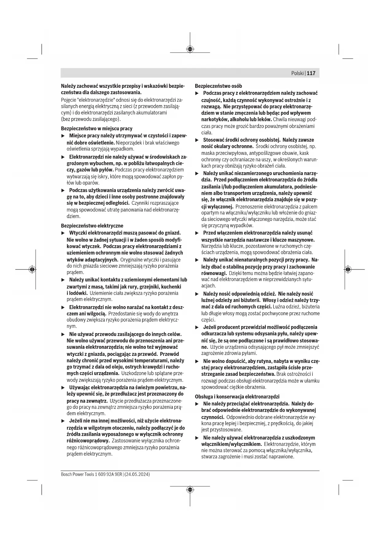 Karasoku Mahallesi 28028. Sokak No:20/A Merkez / ADANA Tel.: +903223599710 -3521379 Fax: +903223591323 E-mail: isiklar@isiklarelektrik.com Diğer servis adreslerini şurada bulabilirsiniz: www.bosch-pt.com/serviceaddresses Nakliye Önerilen Lityum İyon aküler tehlikeli madde taşıma yönetmeliği hükümlerine tabidir. Aküler kullanıcı tarafından başka bir hükme tabi olmaksızın kara yollarında taşınabilir. Üçüncü kişiler eliyle yollanma durumunda (örneğin hava yolu ile veya nakliye şirketleri ile) paketleme ve etiketlemeye ilişkin özel hükümlere uyulmalıdır. Gönderi paketlenirken bir tehlikeli madde uzmanından yardım alınmalıdır. Aküleri sadece ve ancak gövdelerinde hasar yoksa gönderin. Açık kontakları kapatın ve aküyü ambalaj içinde hareket etmeyecek biçimde paketleyin. Lütfen olası ek ulusal yönetmelik hükümlerine de uyun. Tasfiye Elektrikli el aletleri, aküler, aksesuar ve ambalaj malzemesi çevre dostu tasfiye amacıyla bir geri dönüşüm merkezine yollanmalıdır. Elektrikli el aletlerini ve aküleri/bataryaları evsel çöplerin içine atmayın! Sadece AB ülkeleri için: Artık kullanılmayan ve arızalı elektrikli el aletleri veya kullanılmış aküler/piller ayrı olarak imha edilmelidir. Belirtilen toplama sistemlerini kullanın. Atık elektrikli ve elektronik ekipmanlar uygun şekilde imha edilmezse olası tehlikeli maddelerin varlığı nedeniyle çevre ve insan sağlığı üzerinde zararlı etkileri olabilir. Aküler/bataryalar: Lityum iyon: Lütfen nakliye bölümündeki talimata uyun (Bakınız „Nakliye“, Sayfa116). Polski Wskazówki bezpieczeństwa Ogólne wskazówki bezpieczeństwa dotyczące pracy z elektronarzędziami OSTRZEŻENIE Należy zapoznać się ze wszystkimi ostrzeżeniami i wskazówkami do- tyczącymi bezpieczeństwa użytkowania oraz ilustracjami i danymi technicznymi, dostarczonymi wraz z niniejszym elektronarzędziem. Nieprzestrzeganie poniższych wskazó- wek może stać się przyczyną porażenia prądem elektrycz- nym, pożaru i/lub poważnych obrażeń ciała. 1 609 92A 9ER | (24.05.2024) Bosch Power ToolsPolski | 117 Należy zachować wszystkie przepisy i wskazówki bezpie- czeństwa dla dalszego zastosowania. Pojęcie "elektronarzędzie" odnosi się do elektronarzędzi za- silanych energią elektryczną z sieci (z przewodem zasilają- cym) i do elektronarzędzi zasilanych akumulatorami (bezprzewodu zasilającego). Bezpieczeństwo w miejscu pracy u Miejsce pracy należy utrzymywać w czystości i zapew- nić dobre oświetlenie. Nieporządek i brak właściwego oświetlenia sprzyjają wypadkom. u Elektronarzędzi nie należy używać w środowiskach za- grożonym wybuchem, np. w pobliżu łatwopalnych cie- czy, gazów lub pyłów. Podczas pracy elektronarzędziem wytwarzają się iskry, które mogą spowodować zapłon py- łów lub oparów. u Podczas użytkowania urządzenia należy zwrócić uwa- gę na to, aby dzieci i inne osoby postronne znajdowały się w bezpiecznej odległości. Czynniki rozpraszające mogą spowodować utratę panowania nad elektronarzę- dziem. Bezpieczeństwo elektryczne u Wtyczki elektronarzędzi muszą pasować do gniazd. Nie wolno w żadnej sytuacji i w żaden sposób modyfi- kować wtyczek. Podczas pracy elektronarzędziami z uziemieniem ochronnym nie wolno stosować żadnych wtyków adaptacyjnych. Oryginalne wtyczki i pasujące do nich gniazda sieciowe zmniejszają ryzyko porażenia prądem. u Należy unikać kontaktu z uziemionymi elementami lub zwartymi z masą, takimi jak rury, grzejniki, kuchenki ilodówki. Uziemienie ciała zwiększa ryzyko porażenia prądem elektrycznym. u Elektronarzędzi nie wolno narażać na kontakt z desz- czem ani wilgocią. Przedostanie się wody do wnętrza obudowy zwiększa ryzyko porażenia prądem elektrycz- nym. u Nie używać przewodu zasilającego do innych celów. Nie wolno używać przewodu do przenoszenia ani prze- suwania elektronarzędzia; nie wolno też wyjmować wtyczki z gniazda, pociągając za przewód. Przewód należy chronić przed wysokimi temperaturami, należy go trzymać zdala od oleju, ostrych krawędzi i rucho- mych części urządzenia. Uszkodzone lub splątane prze- wody zwiększają ryzyko porażenia prądem elektrycznym. u Używając elektronarzędzia na świeżym powietrzu, na- leży upewnić się, że przedłużacz jest przeznaczony do pracy na zewnątrz. Użycie przedłużacza przeznaczone- go do pracy na zewnątrz zmniejsza ryzyko porażenia prą- dem elektrycznym. u Jeżeli nie ma innej możliwości, niż użycie elektrona- rzędzia w wilgotnym otoczeniu, należy podłączyć je do źródła zasilania wyposażonego w wyłącznik ochronny różnicowoprądowy. Zastosowanie wyłącznika ochron- nego różnicowoprądowego zmniejsza ryzyko porażenia prądem elektrycznym. Bezpieczeństwo osób u Podczas pracy z elektronarzędziem należy zachować czujność, każdą czynność wykonywać ostrożnie i z rozwagą. Nie przystępować do pracy elektronarzę- dziem w stanie zmęczenia lub będąc pod wpływem narkotyków, alkoholu lub leków. Chwila nieuwagi pod- czas pracy może grozić bardzo poważnymi obrażeniami ciała. u Stosować środki ochrony osobistej. Należy zawsze nosić okulary ochronne. Środki ochrony osobistej, np. maska przeciwpyłowa, antypoślizgowe obuwie, kask ochronny czy ochraniacze na uszy, w określonych warun- kach pracy obniżają ryzyko obrażeń ciała. u Należy unikać niezamierzonego uruchomienia narzę- dzia. Przed podłączeniem elektronarzędzia do źródła zasilania i/lub podłączeniem akumulatora, podniesie- niem albo transportem urządzenia, należy upewnić się, że włącznik elektronarzędzia znajduje się w pozy- cji wyłączonej. Przenoszenie elektronarzędzia z palcem opartym na włączniku/wyłączniku lub włożenie do gniaz- da sieciowego wtyczki włączonego narzędzia, może stać się przyczyną wypadków. u Przed włączeniem elektronarzędzia nale