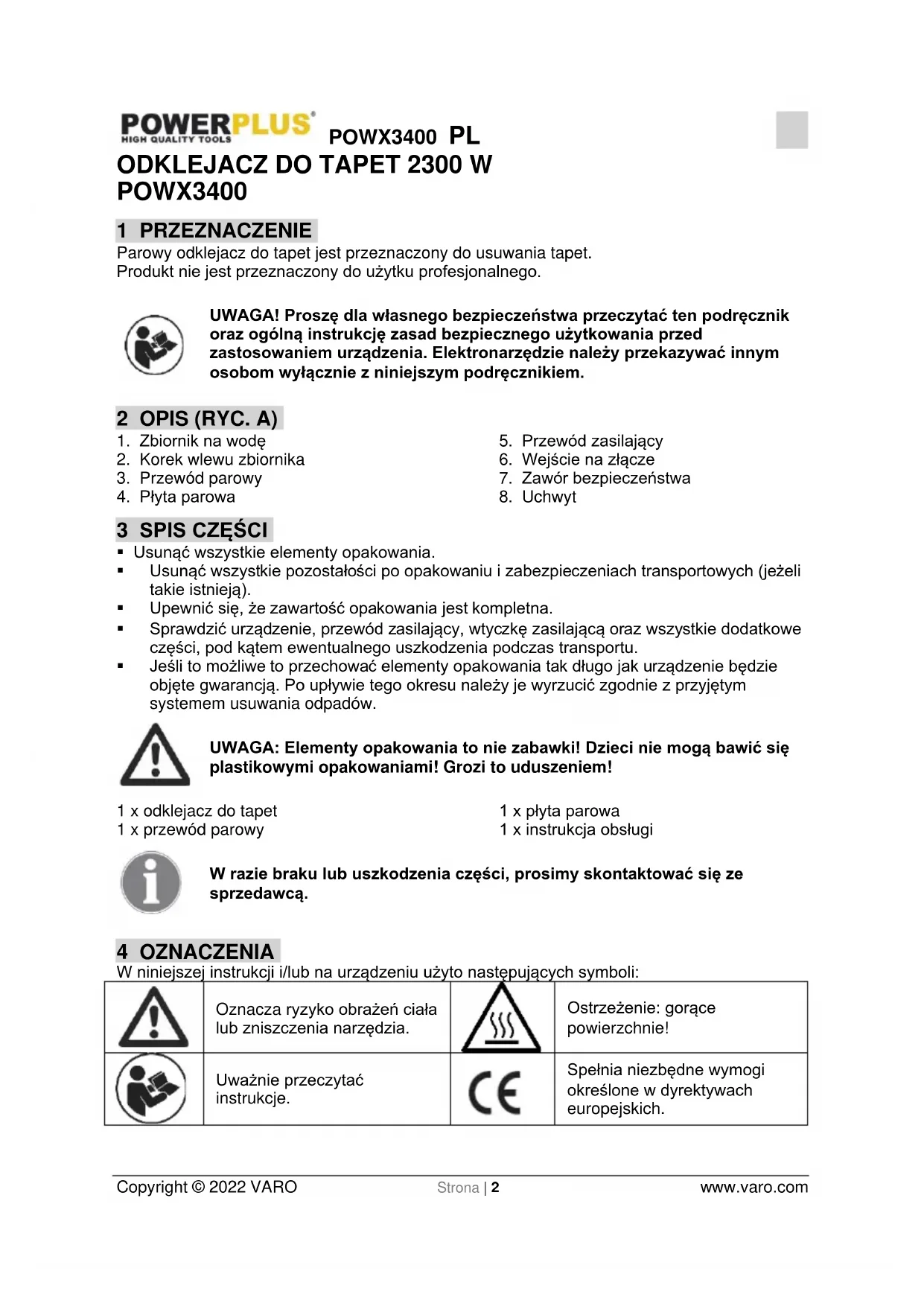 Spełnia niezbędne wymogi określone w dyrektywach europejskich.POWX3400 PL Copyright © 2022 VARO Strona | 3 www.varo.com