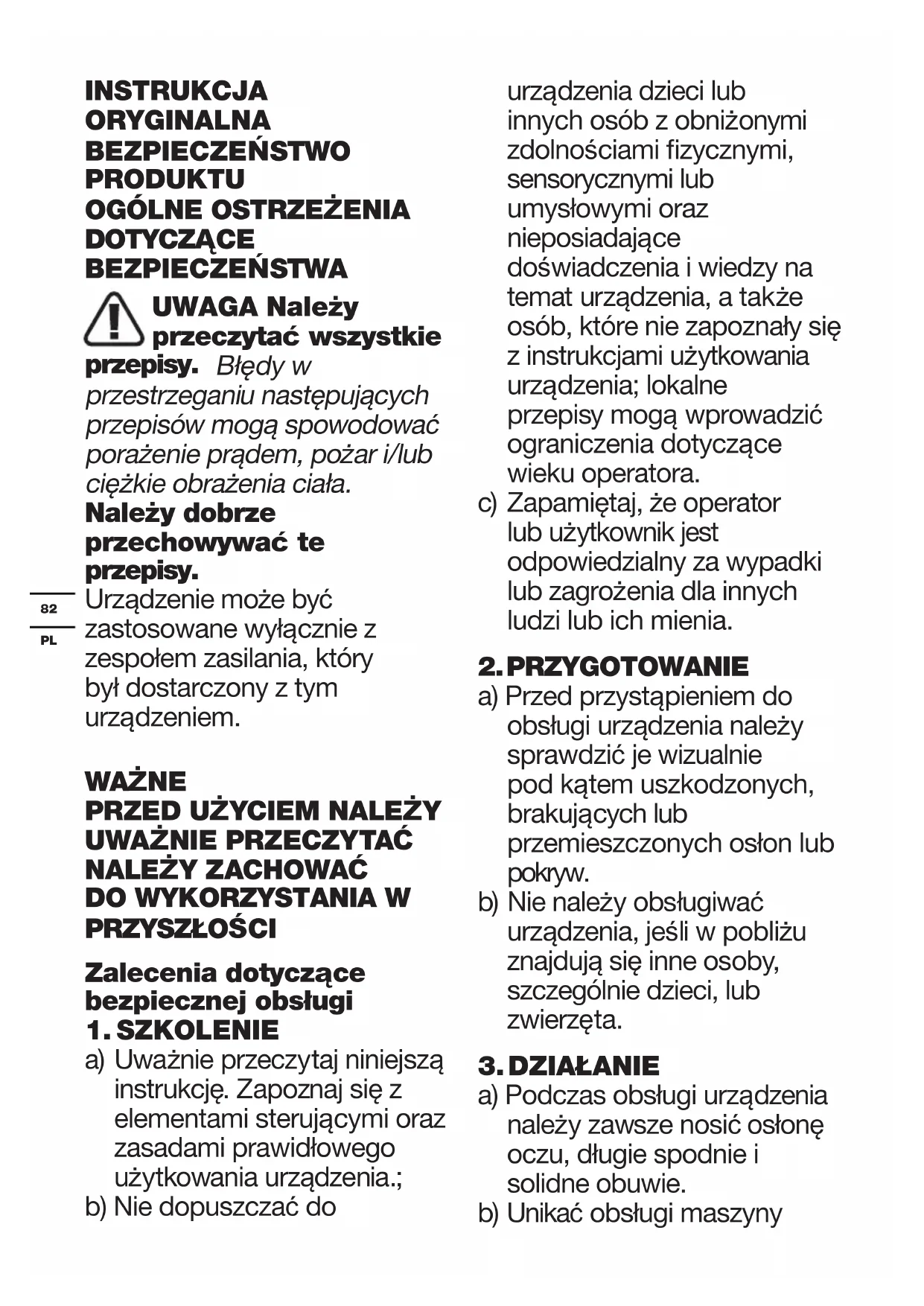 a) Uważnie przeczytaj niniejszą instrukcję. Zapoznaj się z elementami sterującymi oraz zasadami prawidłowego użytkowania urządzenia.; b) Nie dopuszczać do urządzenia dzieci lub innych osób z obniżonymi zdolnościami zycznymi, sensorycznymi lub umysłowymi oraz nieposiadające doświadczenia i wiedzy na temat urządzenia, a także osób, które nie zapoznały się z instrukcjami użytkowania urządzenia; lokalne przepisy mogą wprowadzić ograniczenia dotyczące wieku operatora. c) Zapamiętaj, że operator lub użytkownik jest odpowiedzialny za wypadki lub zagrożenia dla innych ludzi lub ich mienia.