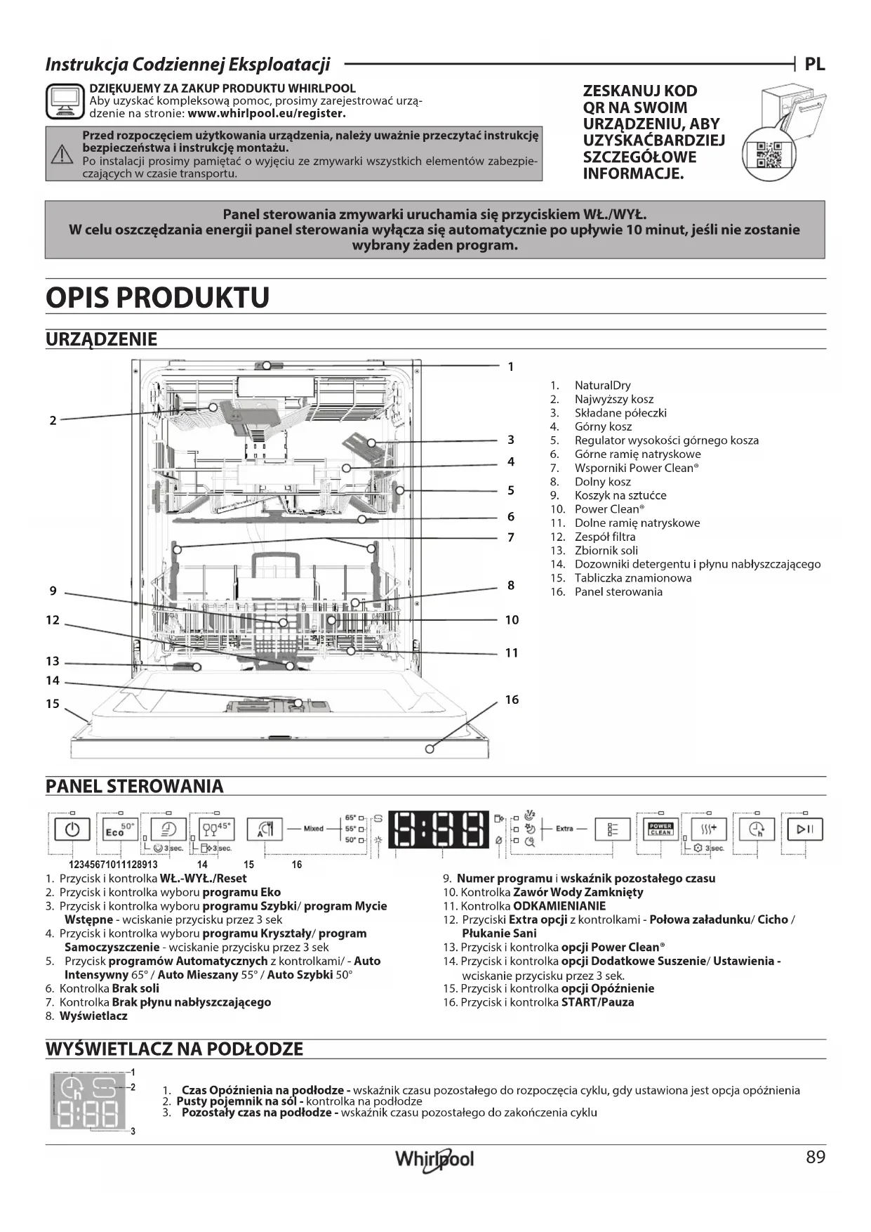 DZIĘKUJEMY ZA ZAKUP PRODUKTU WHIRLPOOL Aby uzyskać kompleksową pomoc, prosimy zarejestrować urzą-dzenie na stronie: www.whirlpool.eu/register.Przed rozpoczęciem użytkowania urządzenia, należy uważnie przeczytać instrukcję bezpieczeństwa iinstrukcję montażu. Po instalacji prosimy pamiętać owyjęciu ze zmywarki wszystkich elementów zabezpie- czających wczasie transportu. ZESKANUJ KOD