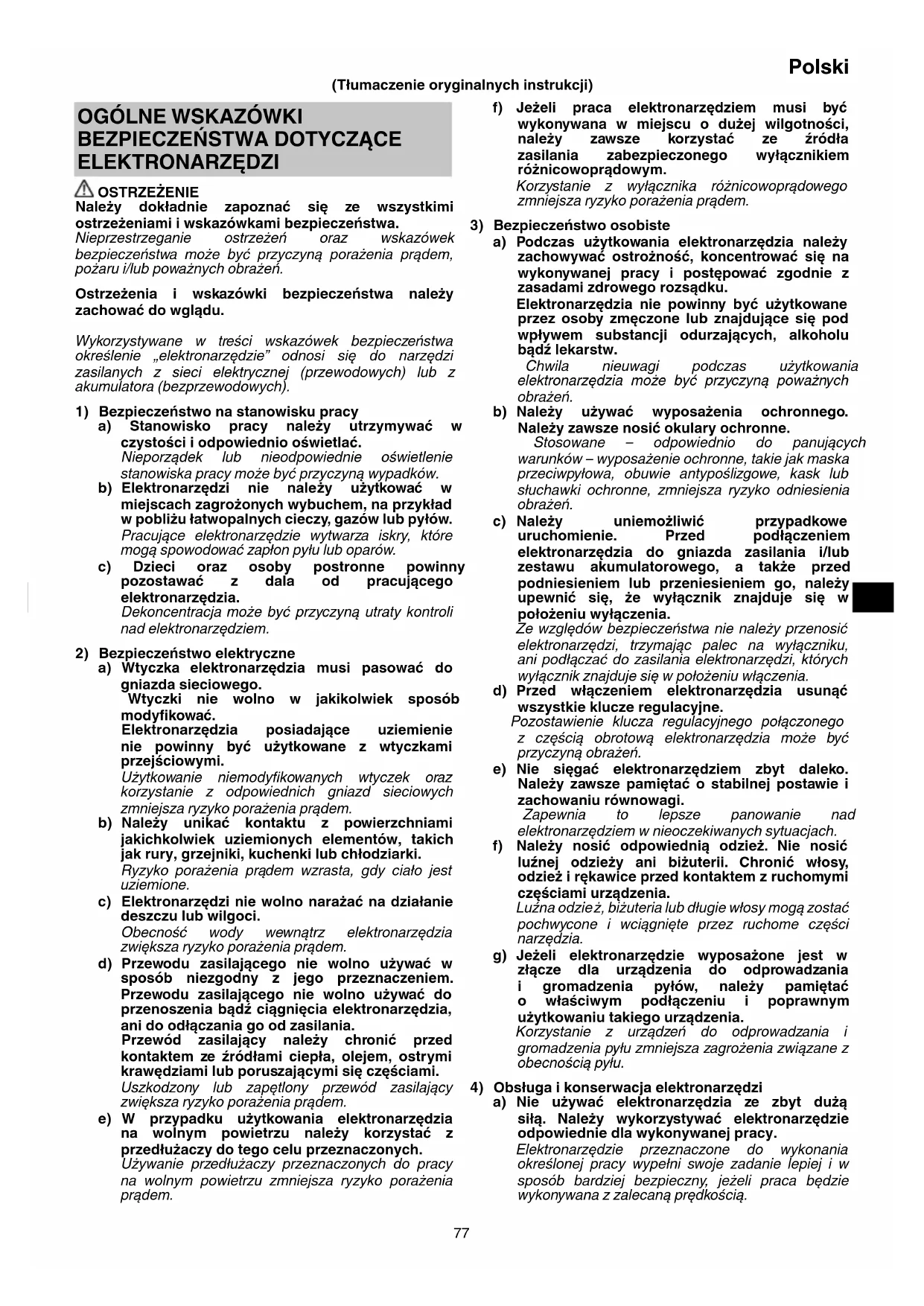 ELEKTRONARZĘDZI OSTRZEŻENIE Należy dokładnie zapoznać się ze wszystkimi ostrzeżeniami i wskazówkami bezpieczeństwa. Nieprzestrzeganie ostrzeżeń oraz wskazówek bezpieczeństwa może być przyczyną porażenia prądem, pożaru i/lub poważnych obrażeń. Ostrzeżenia i wskazówki bezpieczeństwa należy zachować do wglądu. Wykorzystywane w treści wskazówek bezpieczeństwa określenie „elektronarzędzie” odnosi się do narzędzi zasilanych z sieci elektrycznej (przewodowych) lub z akumulatora (bezprzewodowych).