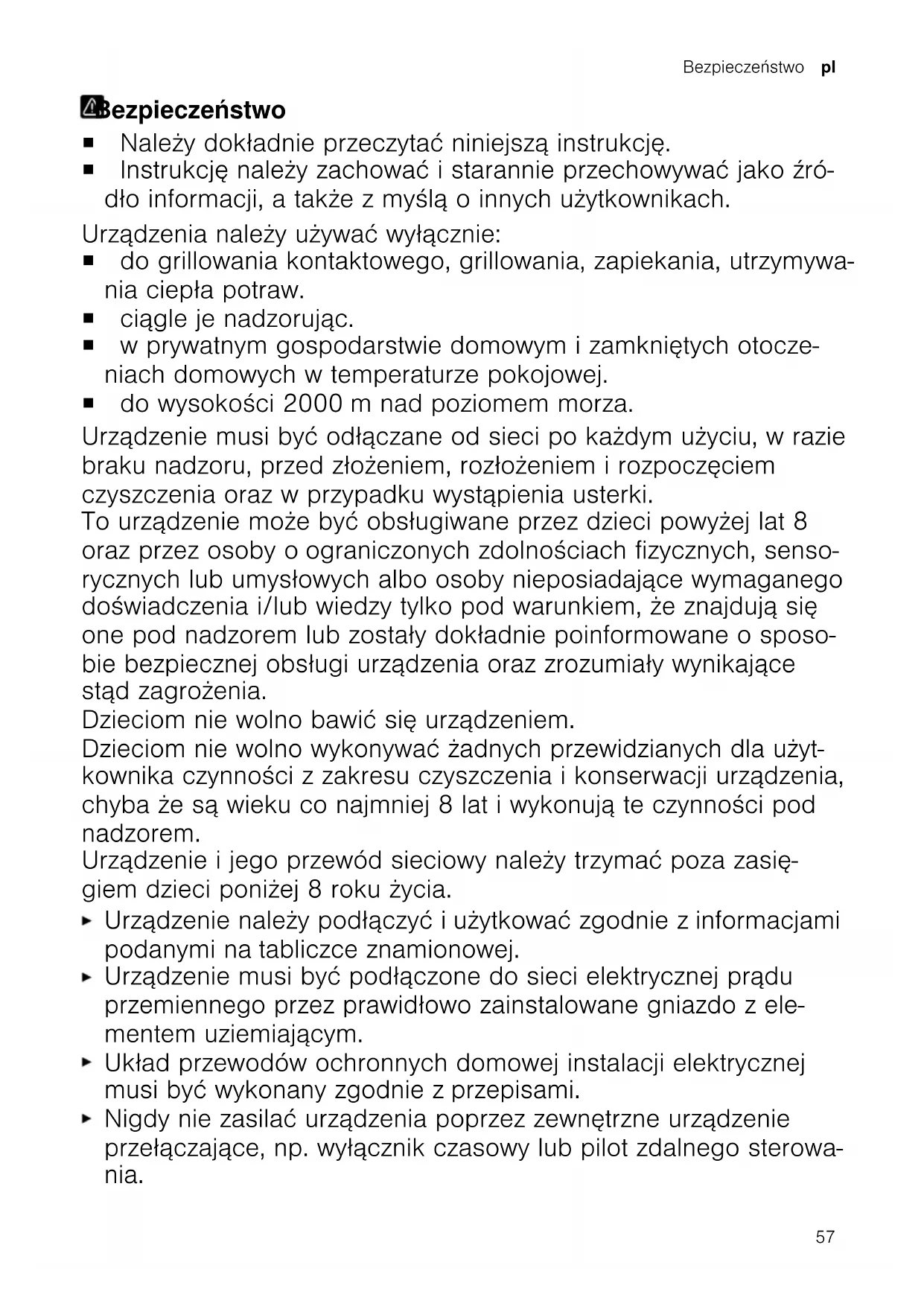 Eski cihazları atığa vermeEski cihazları atığa verme Cihazı çevreye zarar vermeyecek şekilde imha ediniz. Güncel imha yol ve yöntemleri hakkında bilgi edinmek için lütfen yetkili satıcınıza veya bağlı olduğunuz belediyeye ya da şehir idaresine başvurunuz. Bu ürün T.C. Çevre, Şehircilik ve İklim Değişikliği Bakanlığı tarafından yayımlanan “Elektrikli ve Elektronik Eşyalarda Bazı Zararlı Maddelerin Kullanımının Kısıtlanmasına İlişkin Yönetmeliği’nde belirtilen zararlı ve yasaklı maddeleri içermez”. AEEE yönetmeliğine uygundur. 55tr Müşteri hizmetleri Bu ürün, geri dönüşümlü ve tekrar kullanılabilir nitelikteki yüksek kaliteli parça ve malzemelerden üretilmiştir. Bu nedenle, ürünü, hizmet ömrünün sonunda evsel veya diğer atıklarla birlikte atmayın. Elektrikli ve elektronik cihazların geri dönüşümü için bir toplama noktasına götürün. Bu toplama noktalarını bölgenizdeki yerel yönetime sorun. Kullanılmış ürünleri geri kazanıma vererek çevrenin ve doğal kaynakların korunmasına yardımcı olun. Ürünü atmadan önce çocukların güvenliği için elektrik fişini kesin ve kilit mekanizmasını kırarak çalışmaz duruma getirin. Müşteri hizmetleriMüşteri hizmetleri Ülkenizde geçerli olan garanti süresi ve garanti koşulları ile ilgili ayrıntılı bilgileri ekteki belgede yer alan QR kodu aracılığıyla servis iletişim kişilerine ve garanti koşullarına, ekteki müşteri hizmetleri listesinden, müşteri hizmetlerimizden, yetkili satıcımızdan veya Web sitemizden alabilirsiniz. İthalatçı Firma: BSH Ev Aletleri ve Sanayi Ticaret A.Ş. Fatih Sultan Mehmet Mah. Balkan Cad. No:51 Ümraniye-İstanbul-Türkiye Tel : 0216 528 90 00 Fax : 0216 528 99 99 Üretici Firma : BSH Hausgeräte GmbH Carl-Wery Straße 34 81739 München, Germany www.bosch-home.com Müşteri hizmetlerinin iletişim verilerini ekteki belgede yer alan QR kodu aracılığıyla servis iletişim kişilerine ve garanti koşullarına, ekteki müşteri hizmetleri listesinden veya Web sitemizde bulabilirsiniz. Tüm yetkili servis istasyonlarının iletişim bilgilerine aşağıdaki web sitemizden ulaşabilirsiniz. https://www.bosch-yetkiliservisi.com/ Ayrıca yetkili servis istasyonlarına ait bilgiler, ilgili bakanlık tarafından oluşturulan www.servis.gov.tr adresli web sitesinde yer almaktadır. SGM-2024/5 yönetmeliğine uygun bilgileri, cihazınızın ürün sayfasında ve servis sayfasında www.bosch-home.com altında çevrimiçi olarak ilgili kullanım talimatlarında ve ek belgelerde bulabilirsiniz. Garanti Şartları Kullanim Süresi: 10 YIL (Ürünün fonksiyonunu yerine getirebilmesi için gerekli yedek parça bulundurma süresi). %100 geri dönüşümlü kağıt üzerine basılmıştır 56 %100 geri dönüşümlü kağıt üzerine basılmıştırBezpieczeństwo pl Bezpieczeństwo Bezpieczeństwo ¡ Należy dokładnie przeczytać niniejszą instrukcję. ¡ Instrukcję należy zachować i starannie przechowywać jako źró- dło informacji, a także z myślą o innych użytkownikach. Urządzenia należy używać wyłącznie: ¡ do grillowania kontaktowego, grillowania, zapiekania, utrzymywa- nia ciepła potraw. ¡ ciągle je nadzorując. ¡ w prywatnym gospodarstwie domowym i zamkniętych otocze- niach domowych w temperaturze pokojowej. ¡ do wysokości 2000m nad poziomem morza. Urządzenie musi być odłączane od sieci po każdym użyciu, w razie braku nadzoru, przed złożeniem, rozłożeniem i rozpoczęciem czyszczenia oraz w przypadku wystąpienia usterki. To urządzenie może być obsługiwane przez dzieci powyżej lat 8 oraz przez osoby oograniczonych zdolnościach fizycznych, senso- rycznych lub umysłowych albo osoby nieposiadające wymaganego doświadczenia i/lub wiedzy tylko pod warunkiem, że znajdują się one pod nadzorem lub zostały dokładnie poinformowane o sposo- bie bezpiecznej obsługi urządzenia oraz zrozumiały wynikające stąd zagrożenia. Dzieciom nie wolno bawić się urządzeniem. Dzieciom nie wolno wykonywać żadnych przewidzianych dla użyt- kownika czynności z zakresu czyszczenia i konserwacji urządzenia, chyba że są wieku co najmniej 8 lat i wykonują te czynności pod nadzorem. Urządzenie i jego przewód sieciowy należy trzymać poza zasię- giem dzieci poniżej 8 roku życia. Urządzenie należy podłączyć iużytkować zgodnie zinformacjami podanymi natabliczce znamionowej. Urządzenie musi być podłączone do sieci elektrycznej prądu przemiennego przez prawidłowo zainstalowane gniazdo z ele- mentem uziemiającym. Układ przewodów ochronnych domowej instalacji elektrycznej musi być wykonany zgodnie zprzepisami. Nigdy nie zasilać urządzenia poprzez zewnętrzne urządzenie przełączające, np. wyłącznik czasowy lub pilot zdalnego sterowa- nia. 57pl Zapobieganie szkodom materialnym Naprawy urządzenia mogą być wykonywane wyłącznie przez wy- kwalifikowany personel. W przypadku uszkodzenia przewodu sieciowego tego urządze- nia należy zlecić jego wymianę przez producenta, jego serwis lub przez odpowiednio wykwalifikowaną osobę, co jest koniecznym warunkiem wykluczenia zagrożeń. Nigdy nie zanurzać urządzenia lub przewodu sieciowego w wo- dzie ani nie umieszczać ich w zmywarce do naczyń. Nie używać do czyszczenia urządzenia myjek parowych ani ci- śnieniowych. Nigdy nie dopuszczać do kontaktu przewodu sieciowego z gorą- cymi częściami i ostrymi krawędziami. Urządzenie silnie nagrzewa się podczas pracy. Nie doty- kać gorących powierzchni. Podczas pracy dotykać tylko elementów obsługowych lub uchwytu. Przed czyszczeniem lub transportem odczekać, aż urządzenie ostygnie. Urządzenia należy używać tylko w sposób zgodny z przeznacze- niem, pozwoli to uniknąć szkód i obrażeń. Materiały z opakowania należy trzymać poza zasięgiem dzieci. Nie pozwalać dzieciom na zabawę opakowaniem, aszczególnie folią. Drobne części 