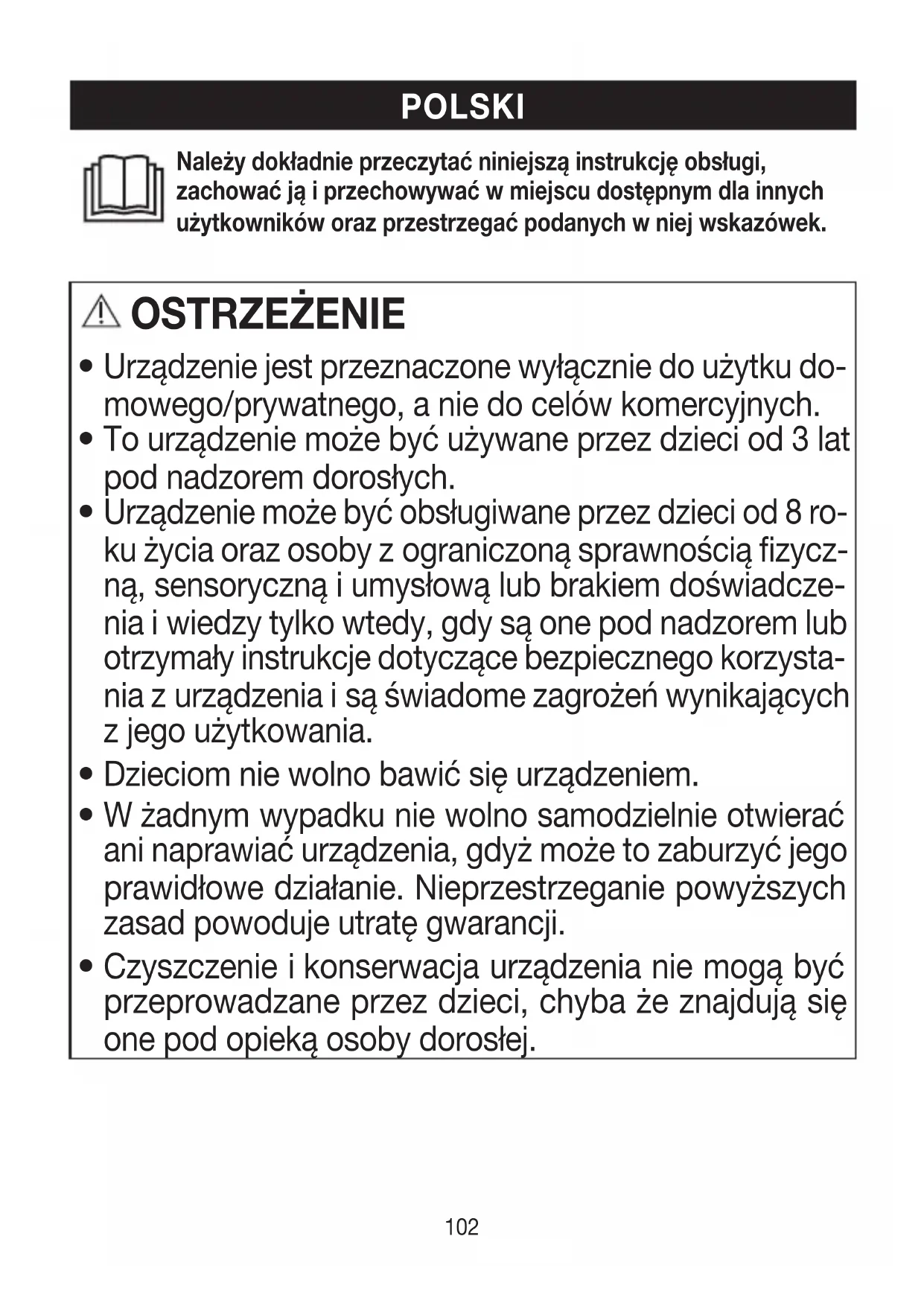 Czyszczenie ikonserwacja urządzenia nie mogą być przeprowadzane przez dzieci, chyba że znajdują się one pod opieką osoby dorosłej. POLSKI Należy dokładnie przeczytać niniejszą instrukcję obsługi, zachować ją iprzechowywać wmiejscu dostępnym dla innych użytkowników oraz przestrzegać podanych wniej wskazówek.102 103