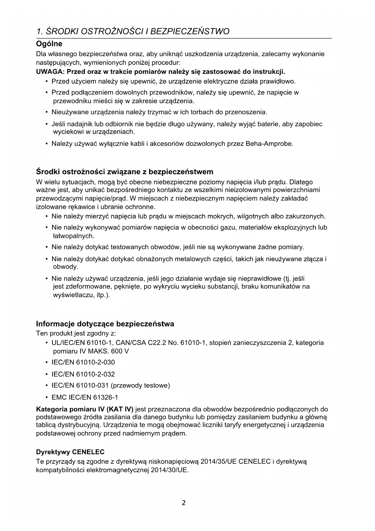 - Należy używać wyłącznie kabli i akcesoriów dozwolonych przez Beha-Amprobe. Środki ostrożności związane z bezpieczeństwem W wielu sytuacjach, mogą być obecne niebezpieczne poziomy napięcia i/lub prądu. Dlatego ważne jest, aby unikać bezpośredniego kontaktu ze wszelkimi nieizolowanymi powierzchniami przewodzącymi napięcie/prąd. W miejscach z niebezpiecznym napięciem należy zakładać izolowane rękawice i ubranie ochronne.