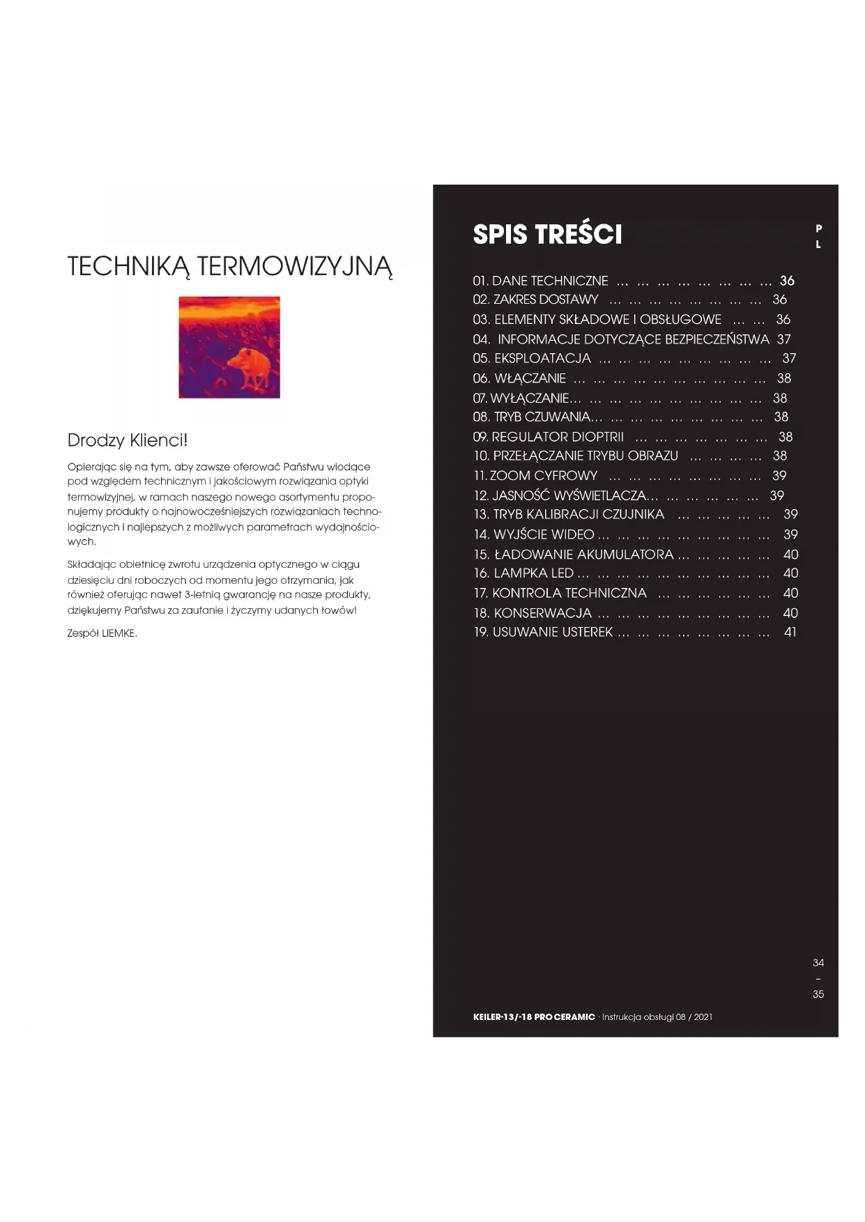 TECHNIKĄ TERMOWIZYJNĄ Drodzy Klienci! Opierając się na tym, aby zawsze oferować Państwu wiodące pod względem technicznym i jakościowym rozwiązania optyki termowizyjnej, w ramach naszego nowego asortymentu propo- nujemy produkty o najnowocześniejszych rozwiązaniach techno- logicznych i najlepszych z możliwych parametrach wydajnościo- wych. Składając obietnicę zwrotu urządzenia optycznego w ciągu dziesięciu dni roboczych od momentu jego otrzymania, jak również oferując nawet 3-letnią gwarancję na nasze produkty, dziękujemy Państwu za zaufanie i życzymy udanych łowów! Zespół LIEMKE. KEILER-13/-18 PRO CERAMIC · Instrukcja obsługi 08 / 2021