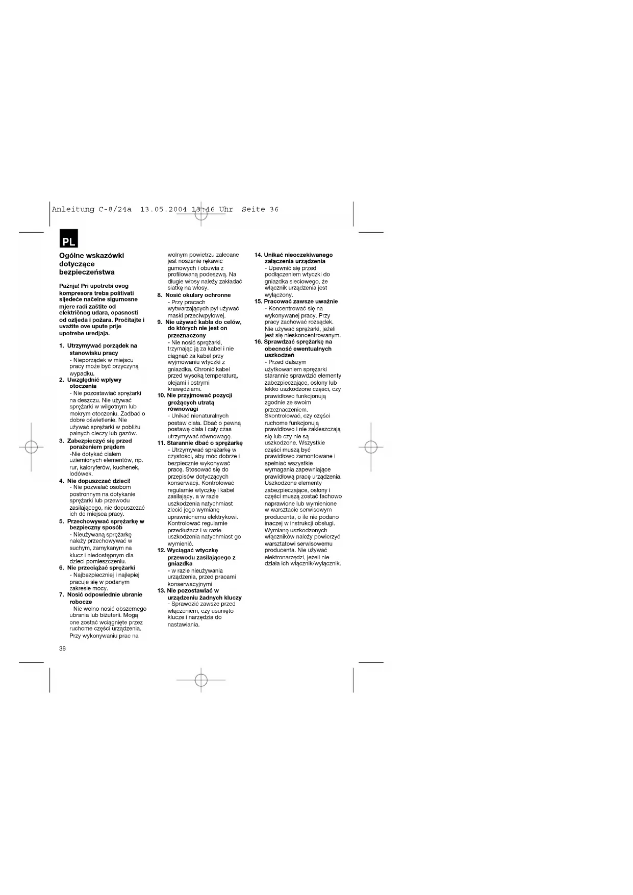 obecność ewentualnych uszkodzeń - Przed dalszym użytkowaniem sprężarki starannie sprawdzić elementy zabezpieczające, osłony lub lekko uszkodzone części, czy prawidłowo funkcjonują zgodnie ze swoim przeznaczeniem. Skontrolować, czy części ruchome funkcjonują prawidłowo i nie zakleszczają się lub czy nie są uszkodzone. Wszystkie części muszą być prawidłowo zamontowane i spełniać wszystkie wymagania zapewniające prawidłową pracę urządzenia. Uszkodzone elementy zabezpieczające, osłony i części muszą zostać fachowo naprawione lub wymienione w warsztacie serwisowym producenta, o ile nie podano inaczej w instrukcji obsługi. Wymianę uszkodzonych włączników należy powierzyć warsztatowi serwisowemu producenta. Nie używać elektronarzędzi, jeżeli nie działa ich włącznik/wyłącznik. Anleitung C-8/24a 13.05.2004 13:46 Uhr Seite 3637
