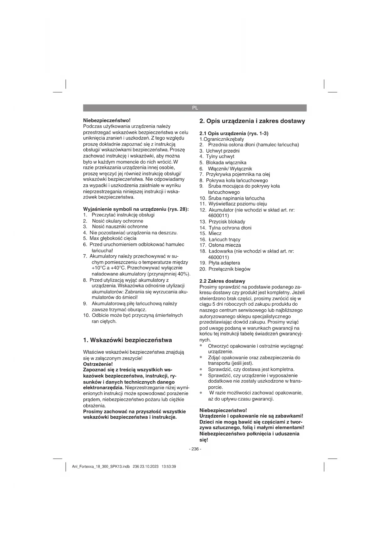 W razie możliwości zachować opakowanie, aż do upływu czasu gwarancji. Niebezpieczeństwo! Urządzenie i opakowanie nie są zabawkami! Dzieci nie mogą bawić się częściami z twor- zywa sztucznego, folią i małymi elementami! Niebezpieczeństwo połknięcia i uduszenia się! Anl_Fortexxa_18_300_SPK13.indb 236 23.10.2023 13:53:39PL