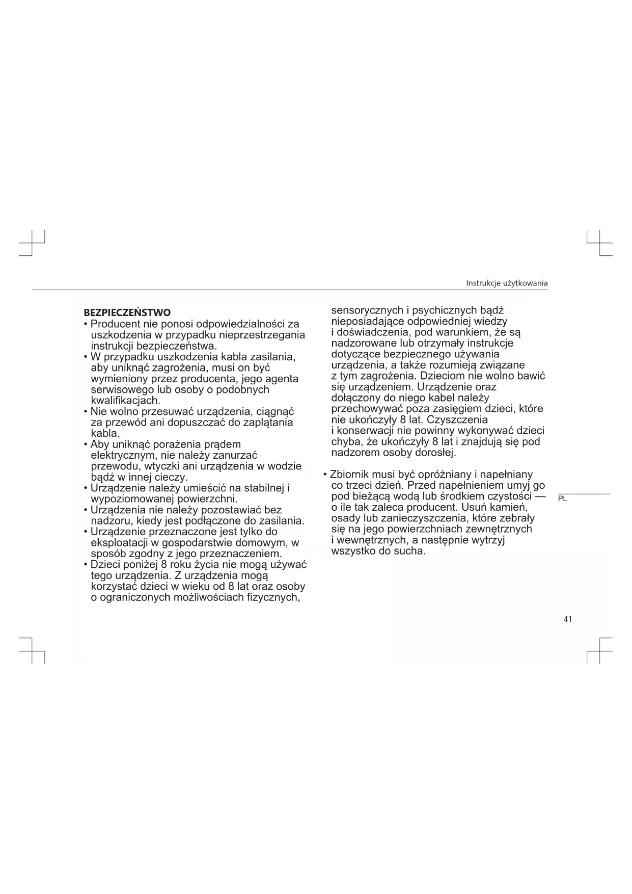- Dzieci poniżej 8 roku życia nie mogą używać tego urządzenia. Zurządzenia mogą korzystać dzieci wwieku od 8 lat oraz osoby oograniczonych możliwościach fizycznych, sensorycznych ipsychicznych bądź nieposiadające odpowiedniej wiedzy idoświadczenia, pod warunkiem, że są nadzorowane lub otrzymały instrukcje dotyczące bezpiecznego używania urządzenia, atakże rozumieją związane ztym zagrożenia. Dzieciom nie wolno bawić się urządzeniem. Urządzenie oraz dołączony do niego kabel należy przechowywać poza zasięgiem dzieci, które nie ukończyły 8 lat. Czyszczenia ikonserwacji nie powinny wykonywać dzieci chyba, że ukończyły 8 lat iznajdują się pod nadzorem osoby dorosłej.